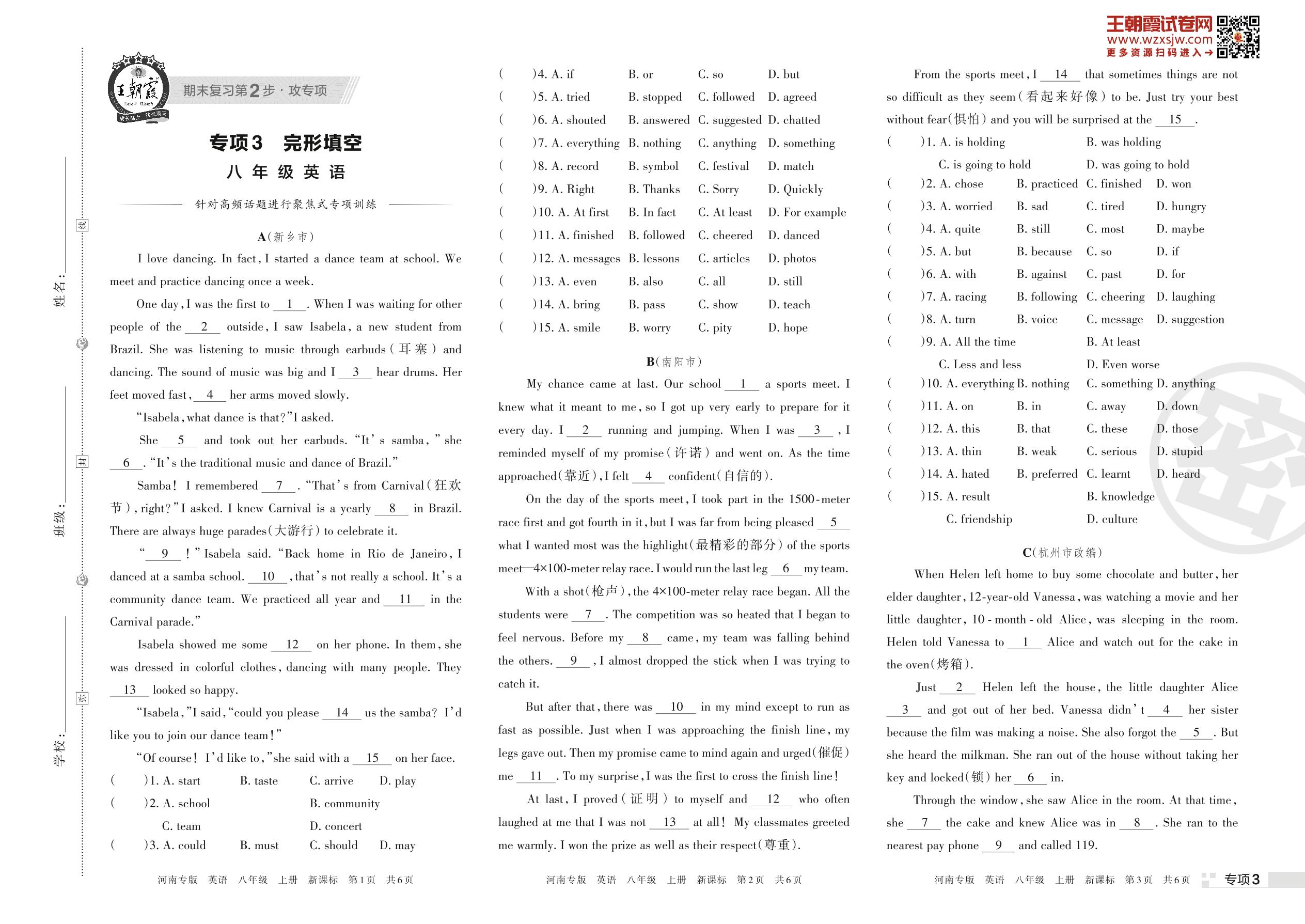 王朝霞期末专项卷——完形填空八年级上册英语(新课标版)【3】