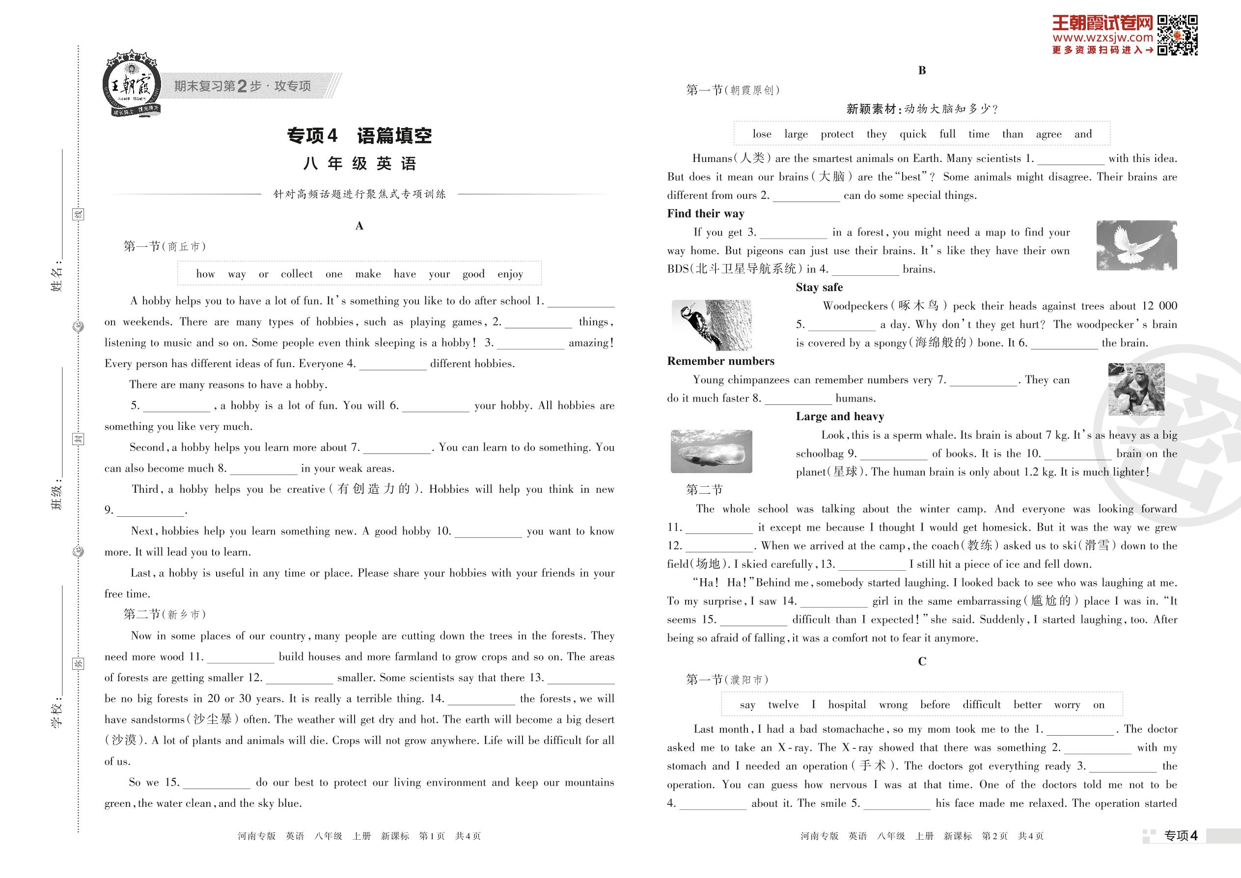 王朝霞期末专项卷——语篇填空八年级上册英语(新课标版)【4】