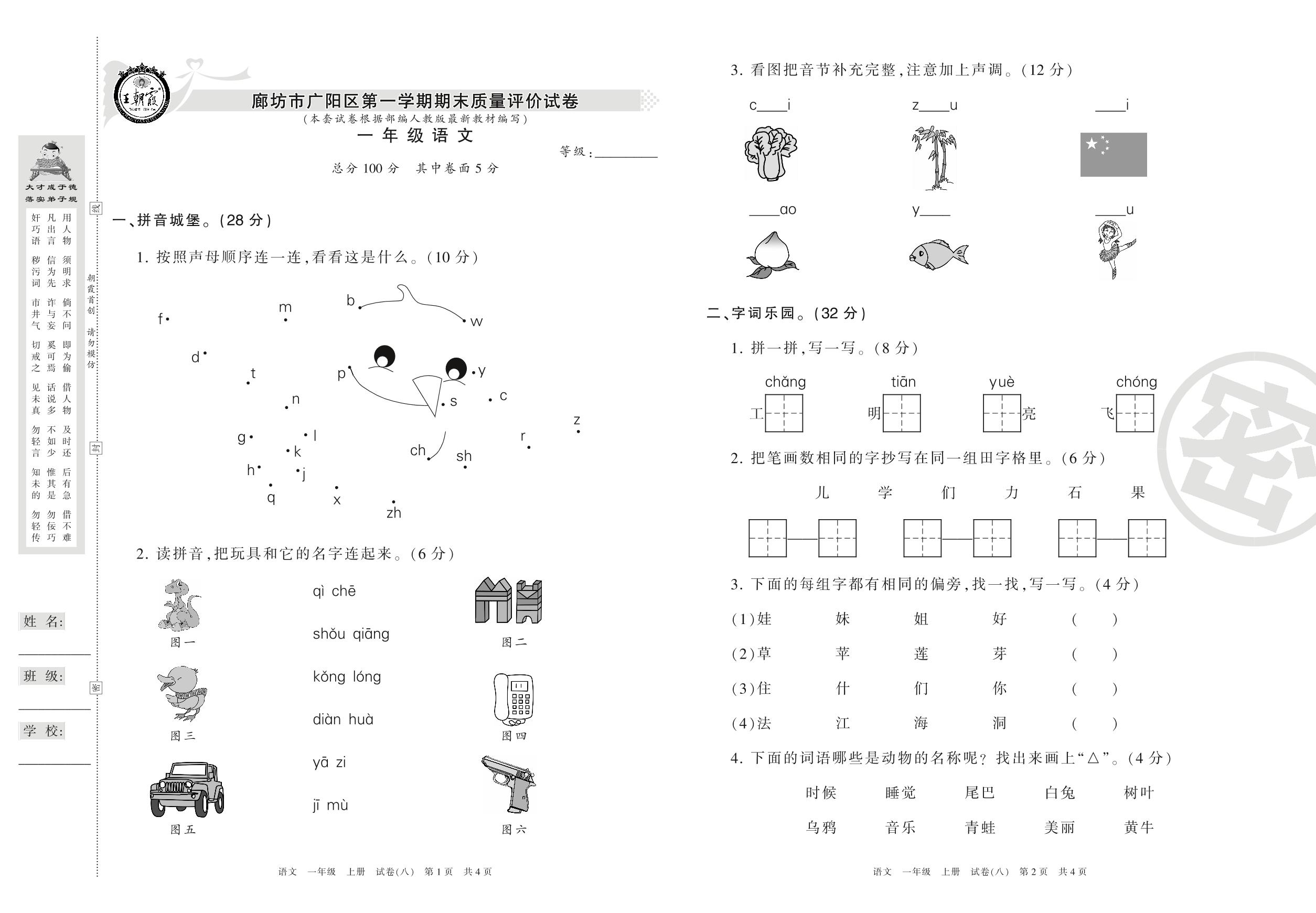 2016-2017学年第一学期廊坊市广阳区一年级语文试卷(人教版)【8】