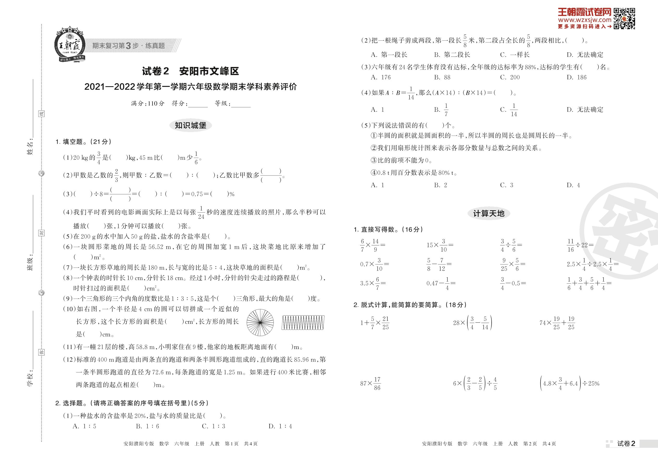 安阳市文峰区2021—2022学年第一学期六年级数学期末学科素养评价(人教版)【2】
