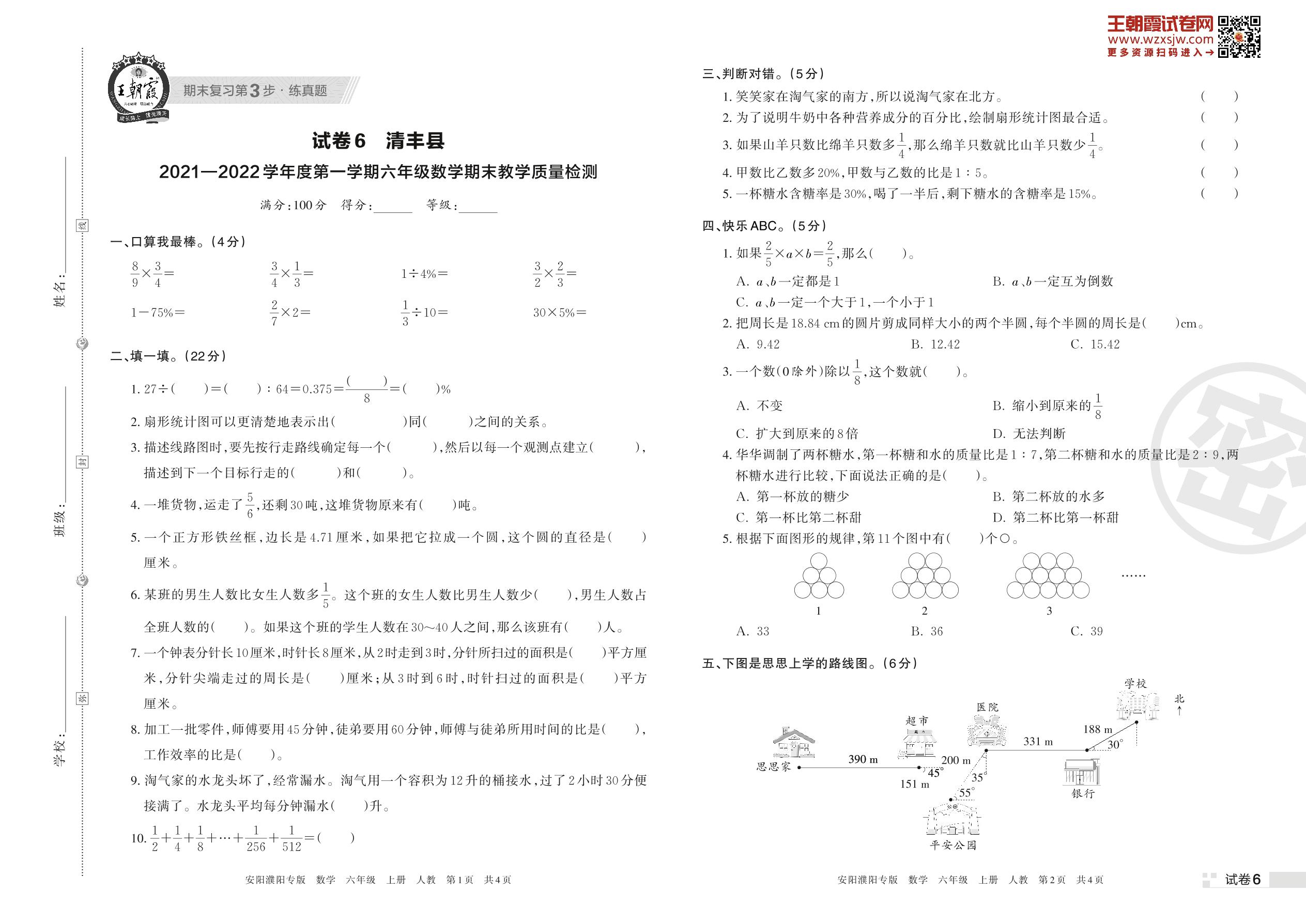 清丰县2021—2022学年度第一学期六年级数学期末教学质量检测(人教版)【6】