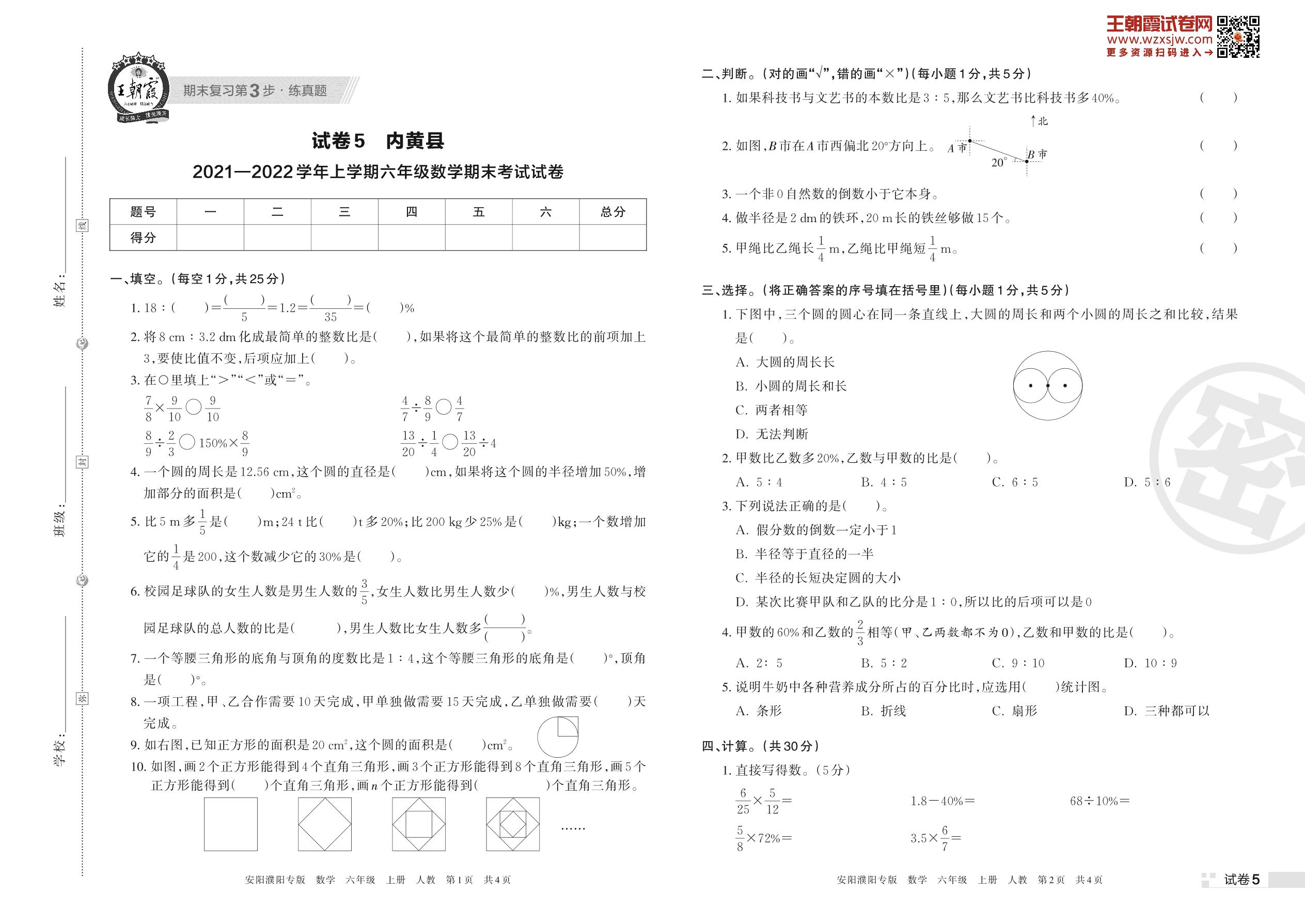 内黄县2021—2022学年上学期六年级数学期末考试试卷(人教版)【5】