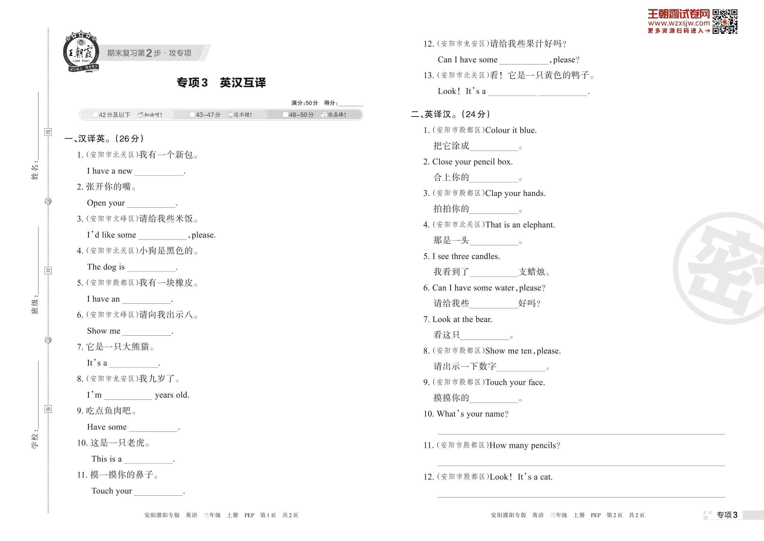 王朝霞期末专项卷——英汉互译三年级上册英语(PEP版)【3】