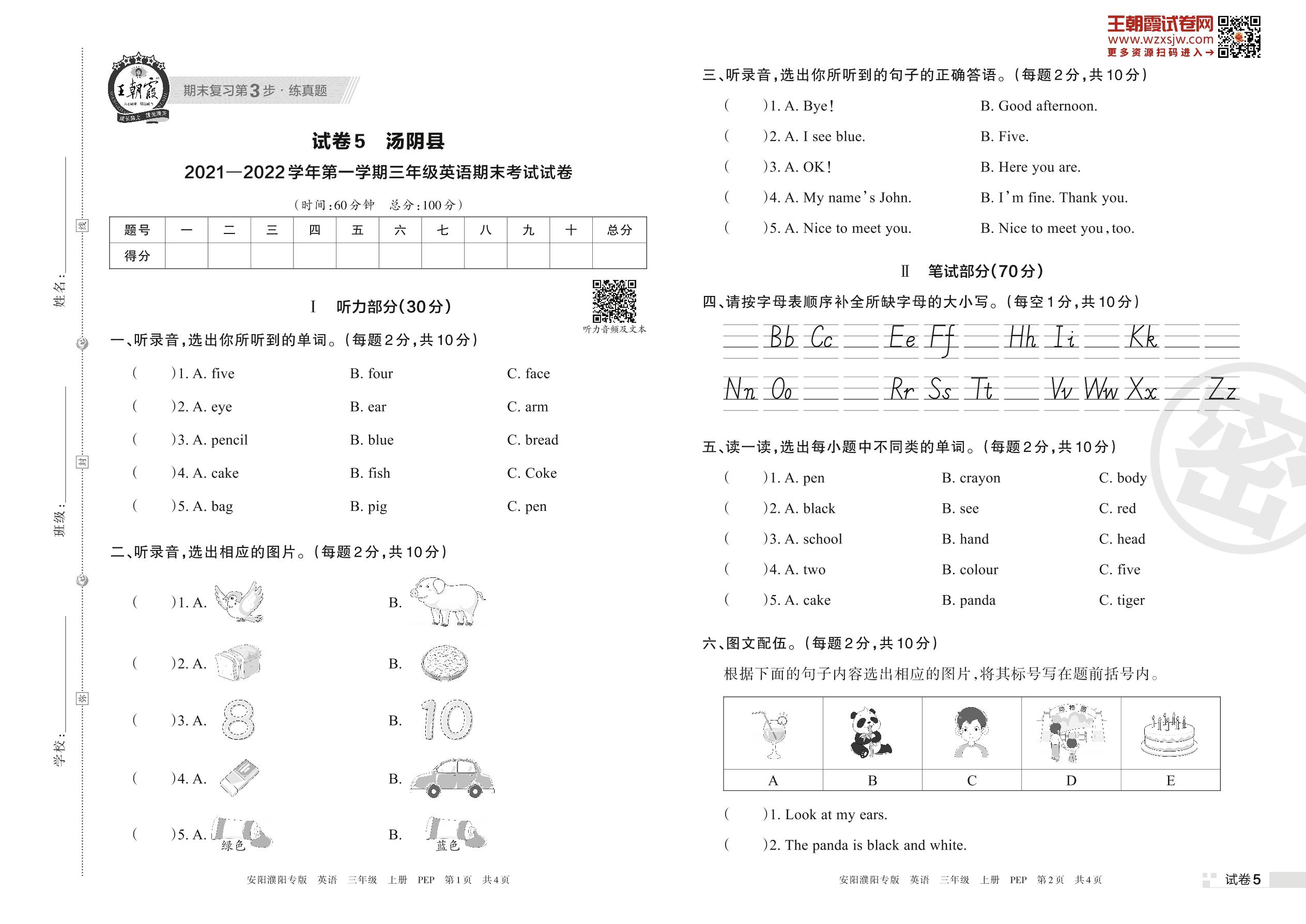 汤阴县2021—2022学年第一学期三年级英语期末考试试卷(PEP版)【5】