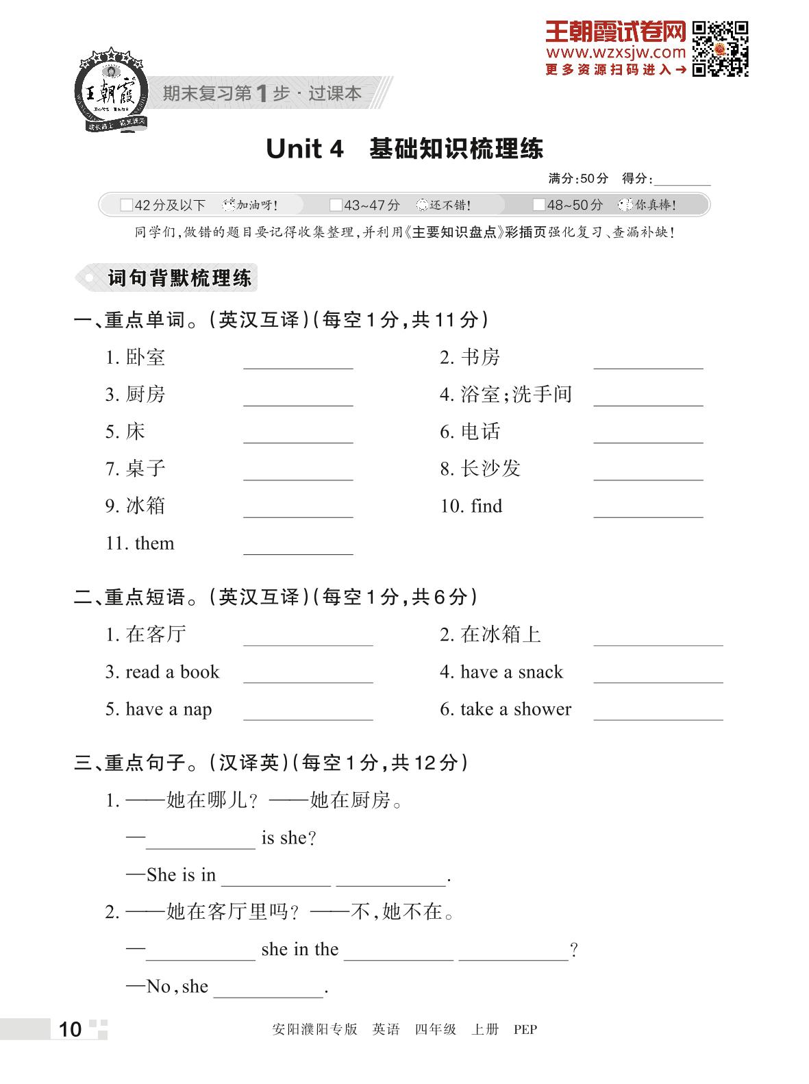 王朝霞期末过课本——Unit 4 基础知识梳理练四年级上册英语(PEP版)_R221117085646573