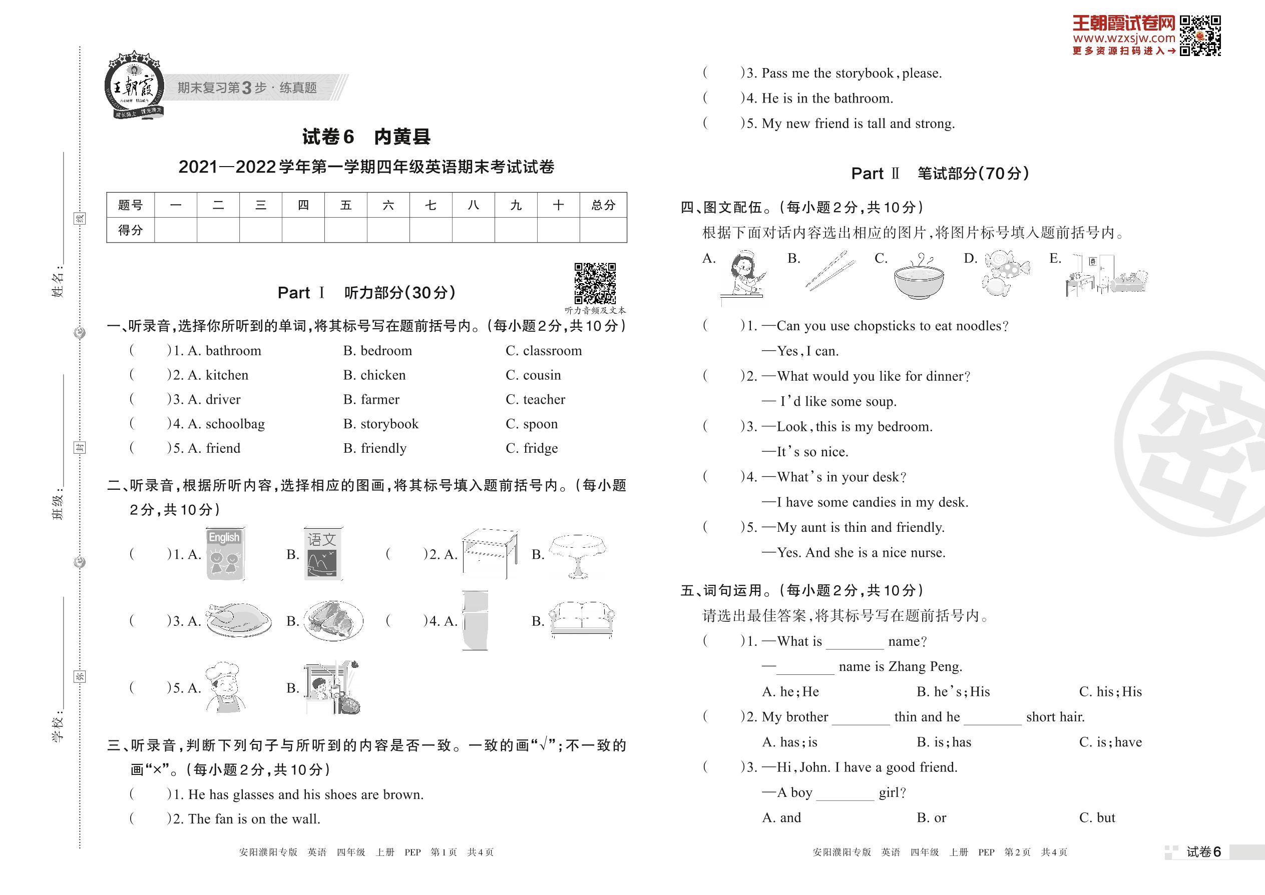 内黄县2021—2022学年第一学期四年级英语期末考试试卷(PEP版)【6】