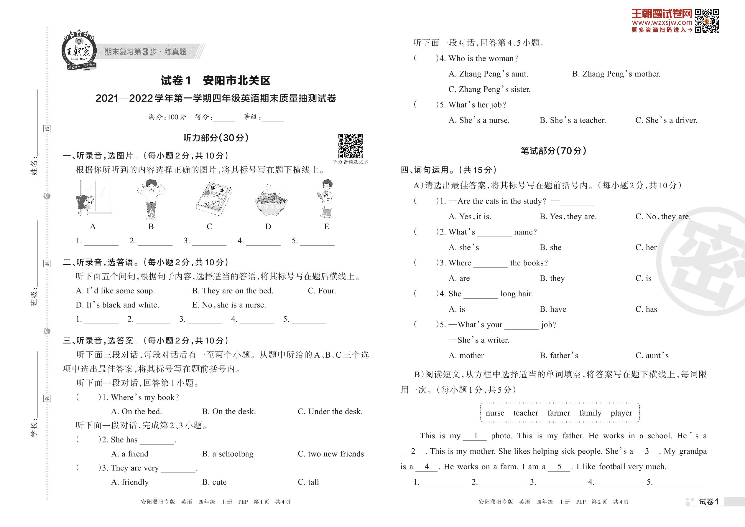 安阳市北关区2021—2022学年第一学期四年级英语期末质量抽测试卷(PEP版)【1】