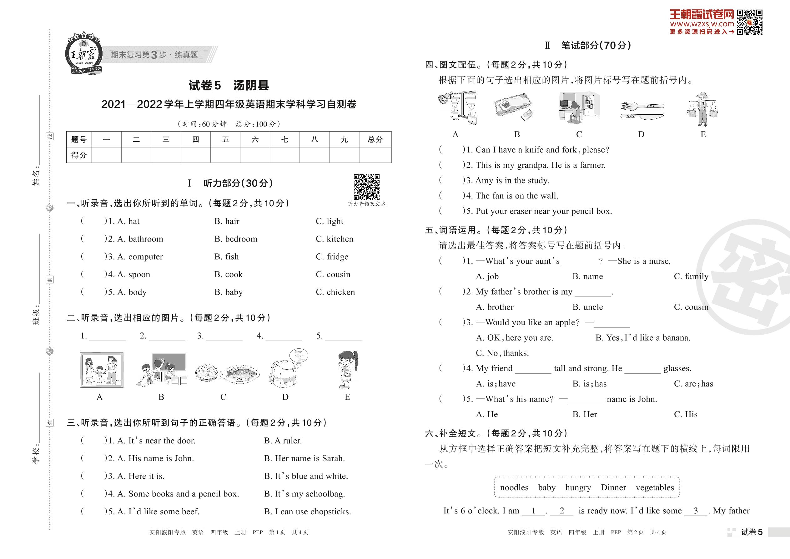 汤阴县2021—2022学年第一学期四年级英语期末考试试卷(PEP版)【5】