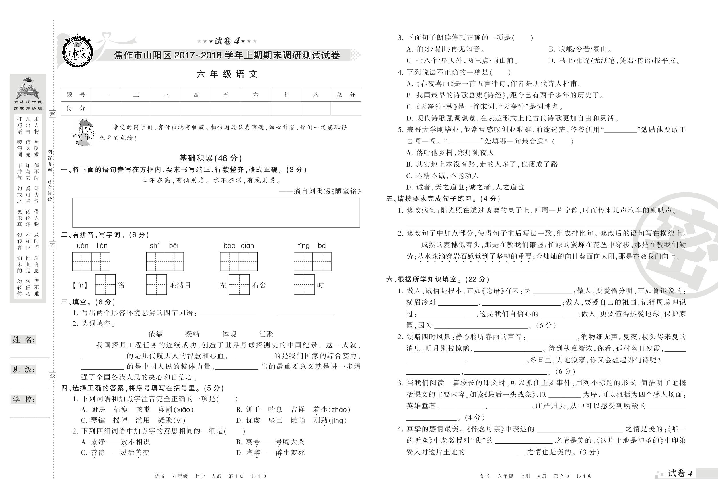 2017-2018学年第一学期焦作市山阳区六年级语文试卷(人教版)【4】
