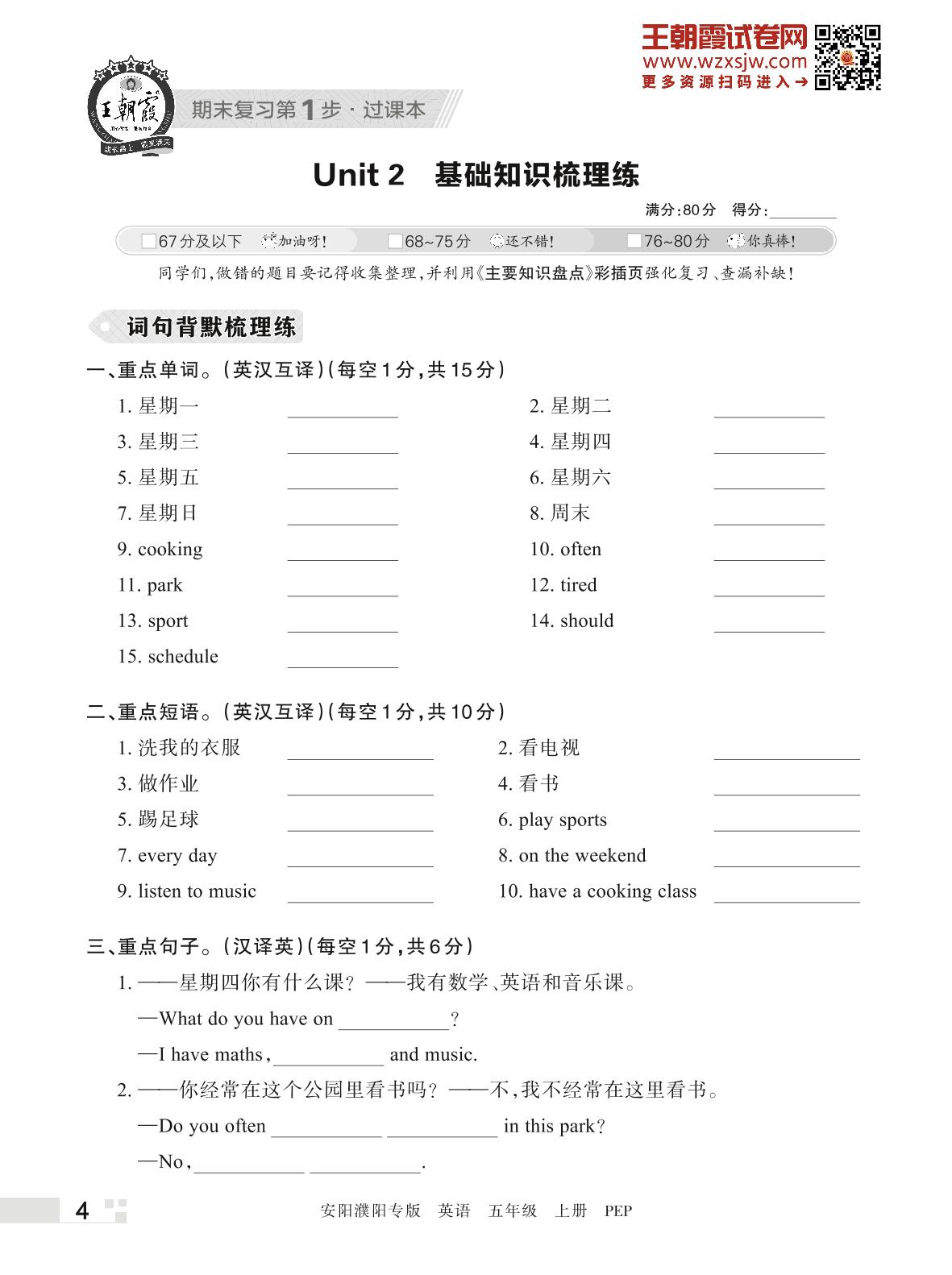 王朝霞期末过课本——Unit 2 基础知识梳理练五年级上册英语(PEP版)_R221117090331487