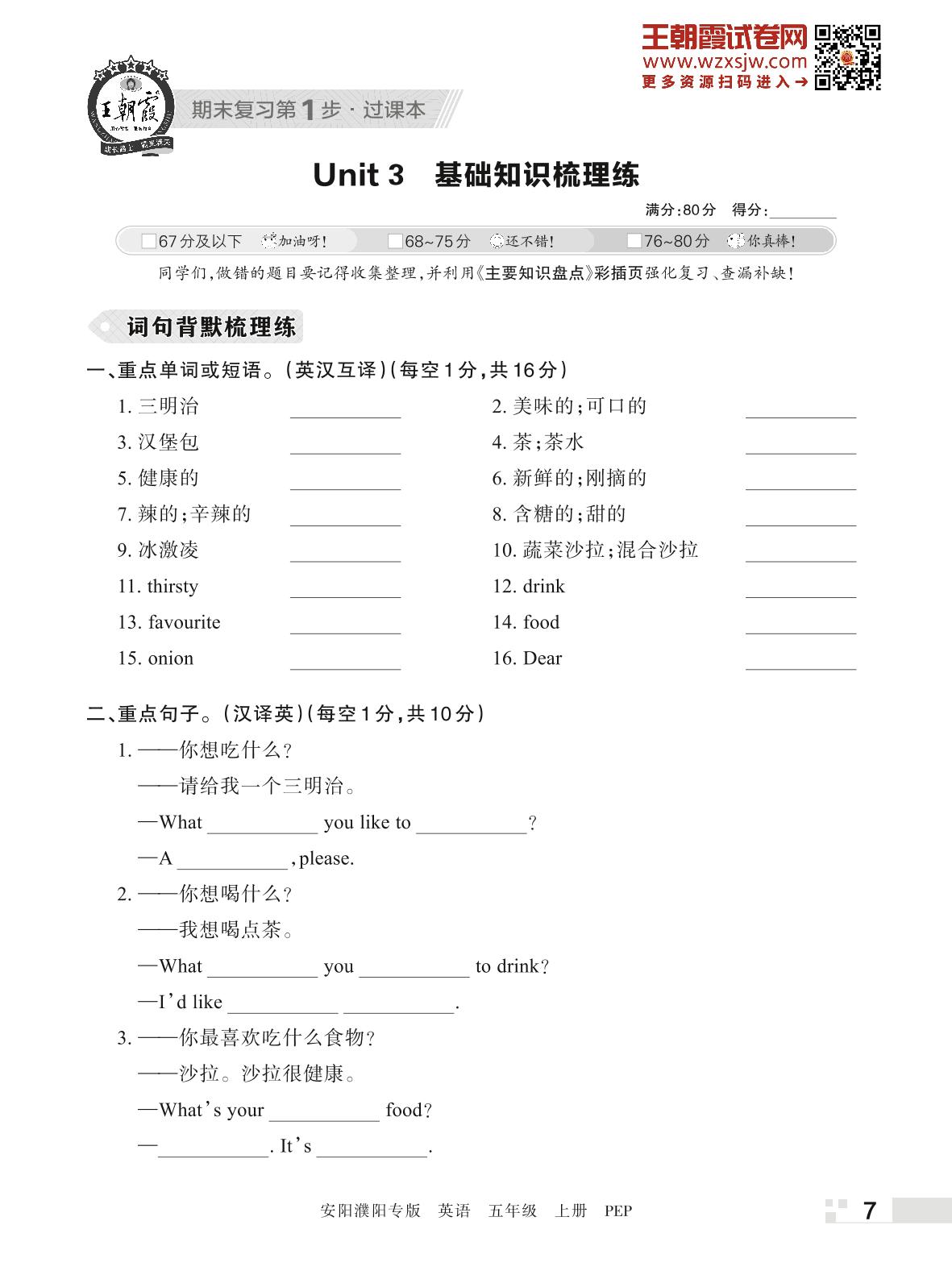 王朝霞期末过课本——Unit 3 基础知识梳理练五年级上册英语(PEP版)_R221117090332489
