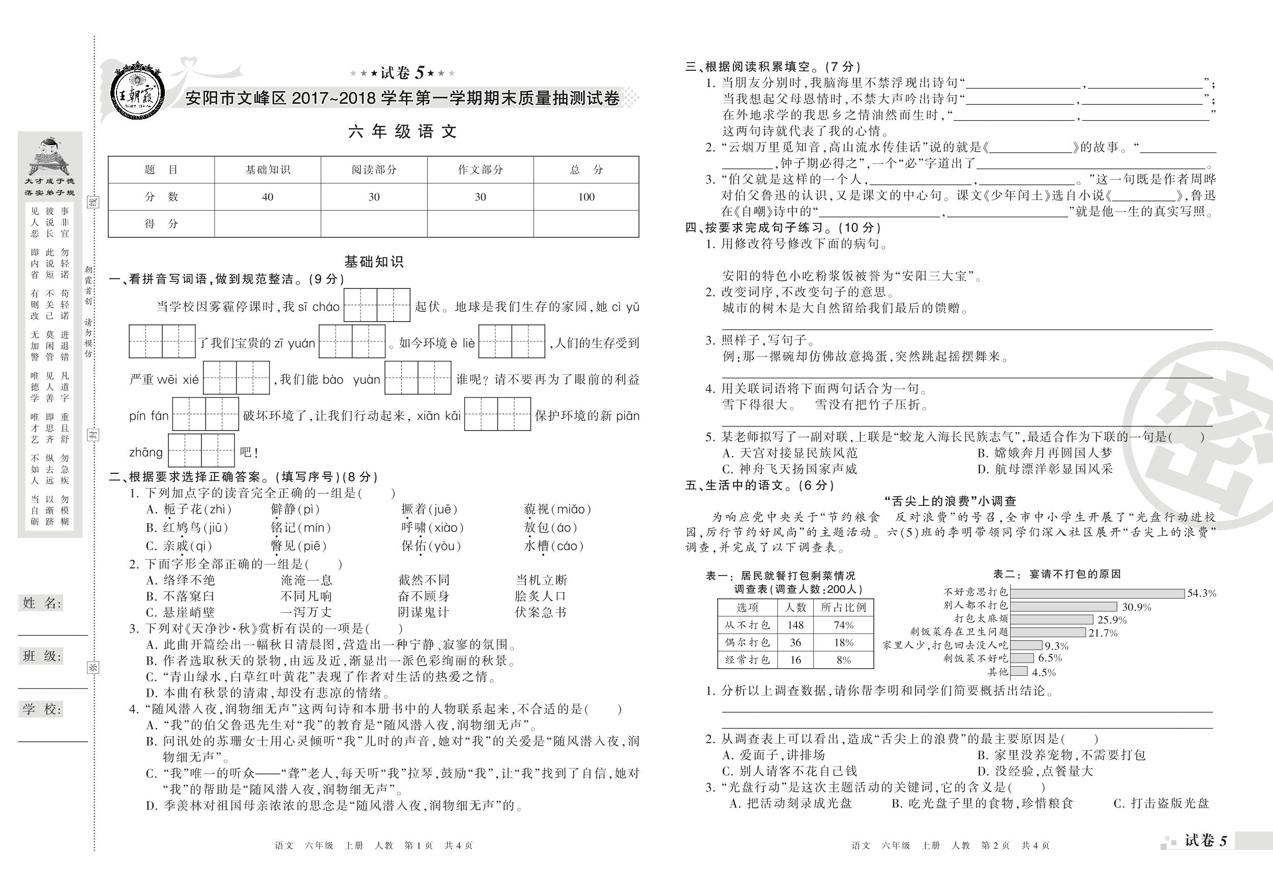 2017-2018学年第一学期安阳市文峰区六年级语文试卷(人教版)【5】