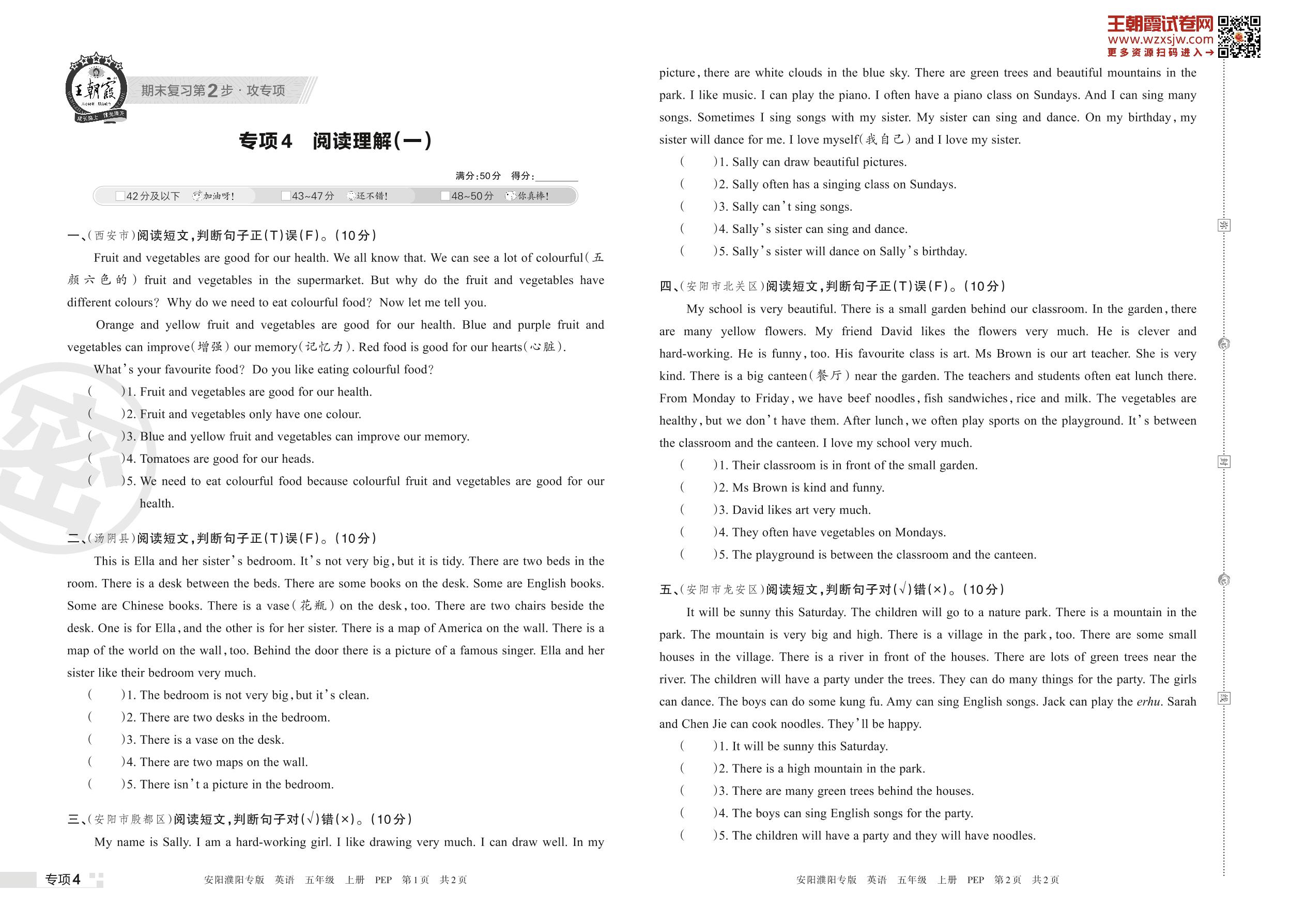 王朝霞期末专项卷——阅读理解(一)五年级上册英语(PEP版)【4】