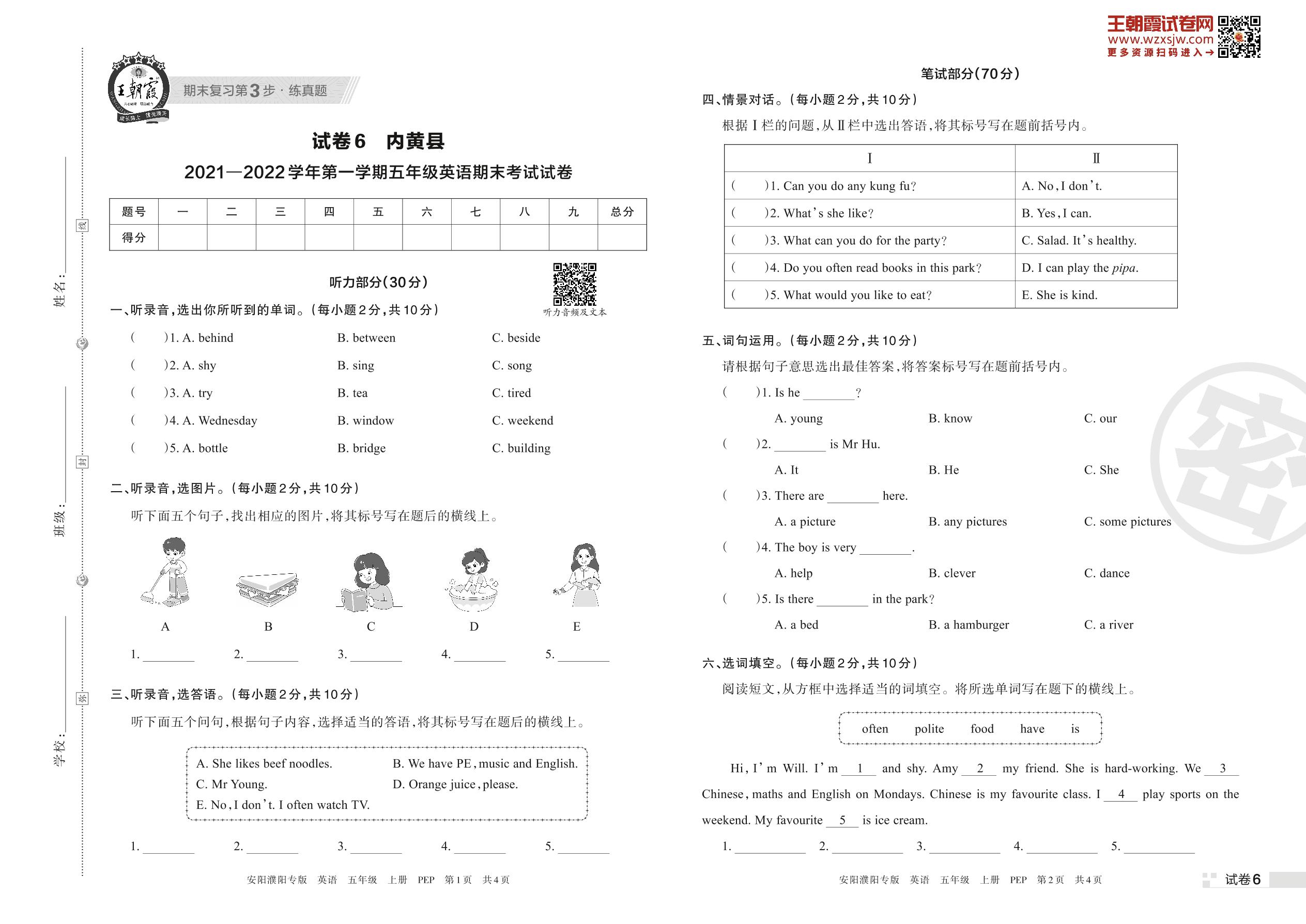 内黄县2021—2022学年第一学期五年级英语期末考试试卷(PEP版)【6】