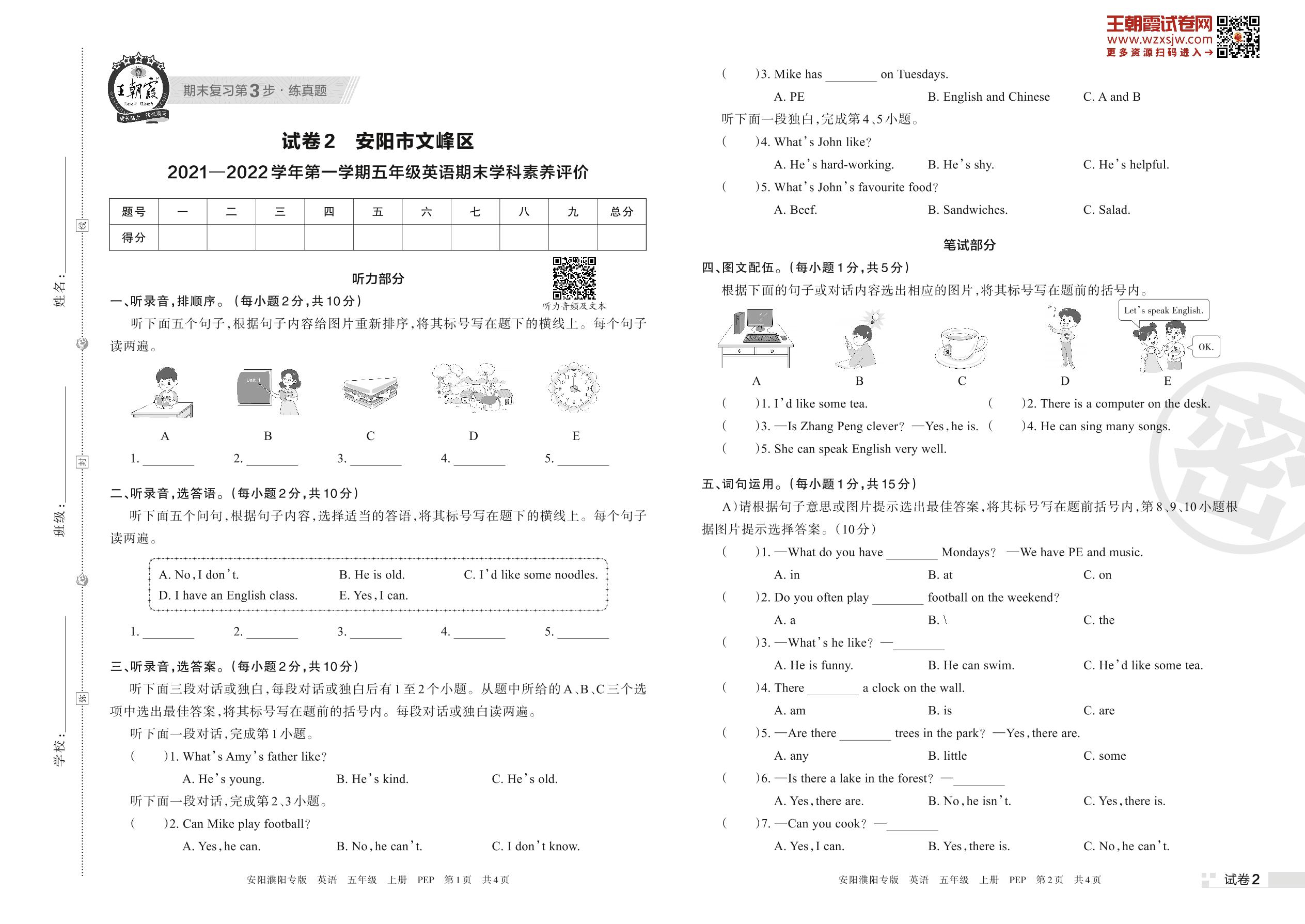 安阳市文峰区2021—2022学年第一学期五年级英语期末学科素养评价(PEP版)【2】