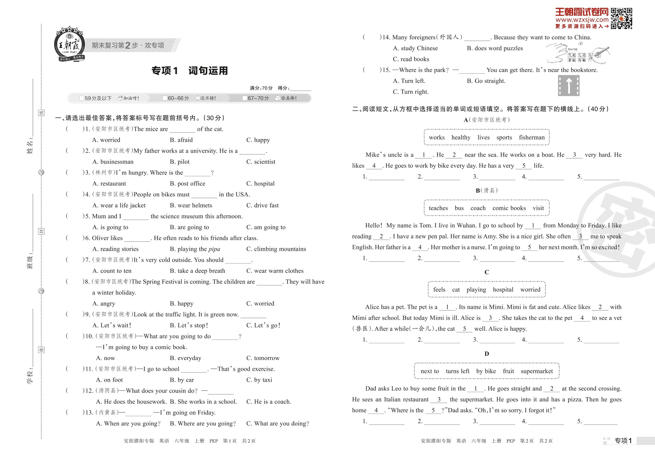 王朝霞期末专项卷——词句运用六年级上册英语(PEP版)【1】