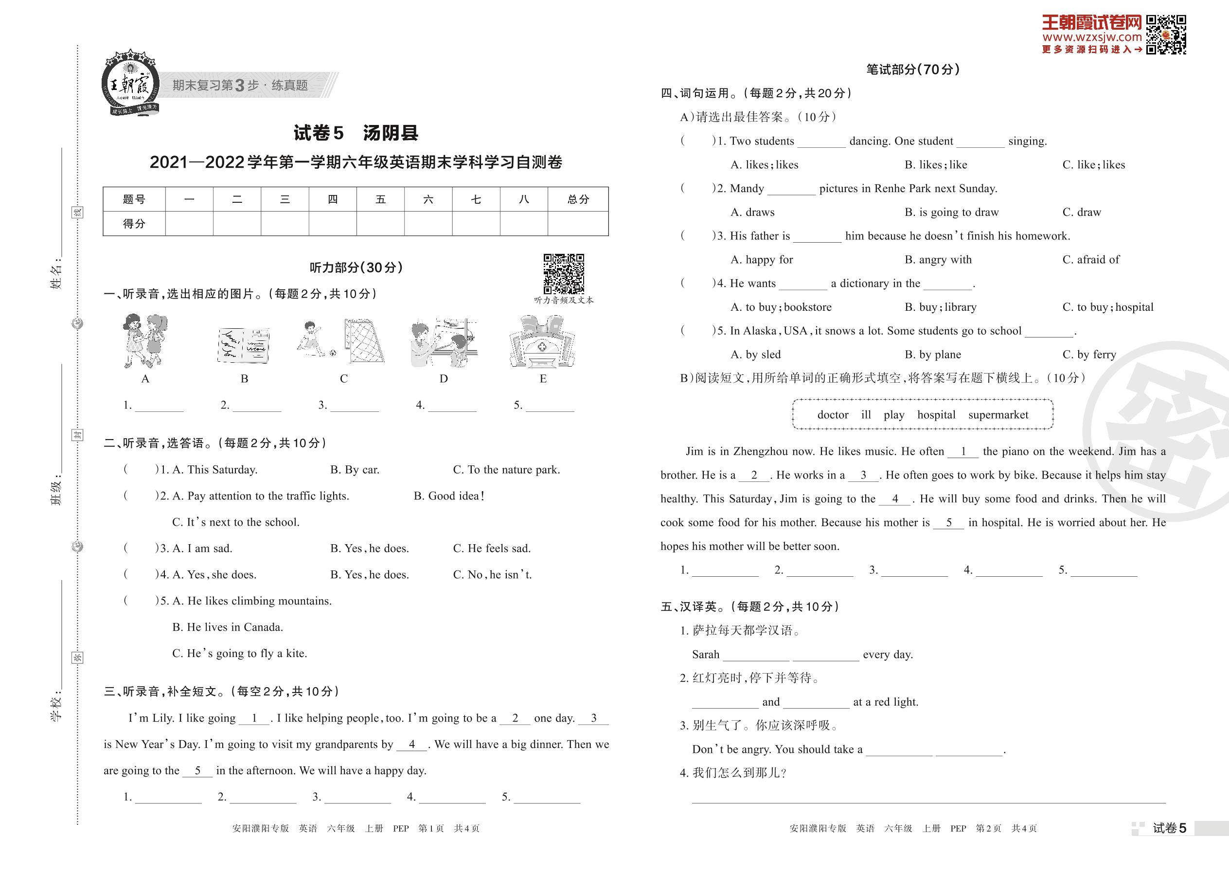 汤阴县2021—2022学年第一学期六年级英语期末考试试卷(PEP版)【5】