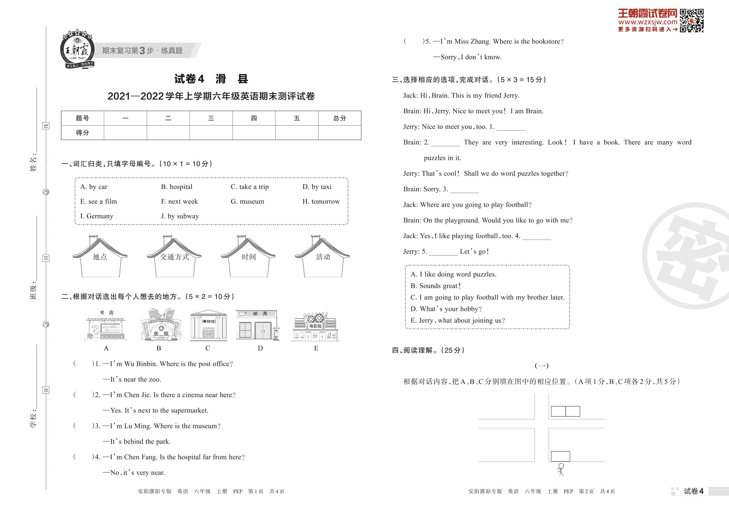 滑县2021—2022学年上学期六年级英语期末测评试卷(PEP版)【4】