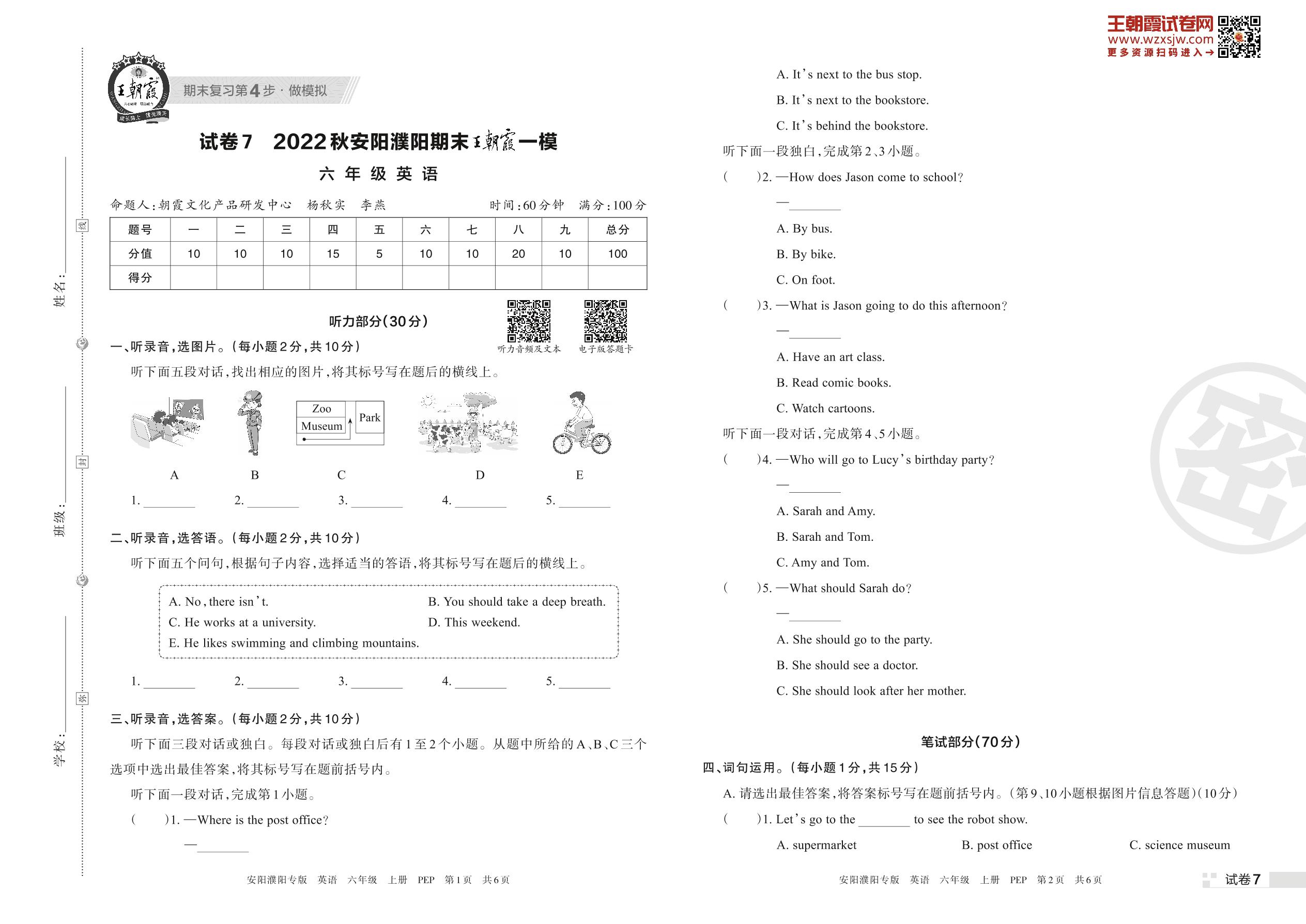 王朝霞期末模拟卷六年级上册英语(PEP版)【7】