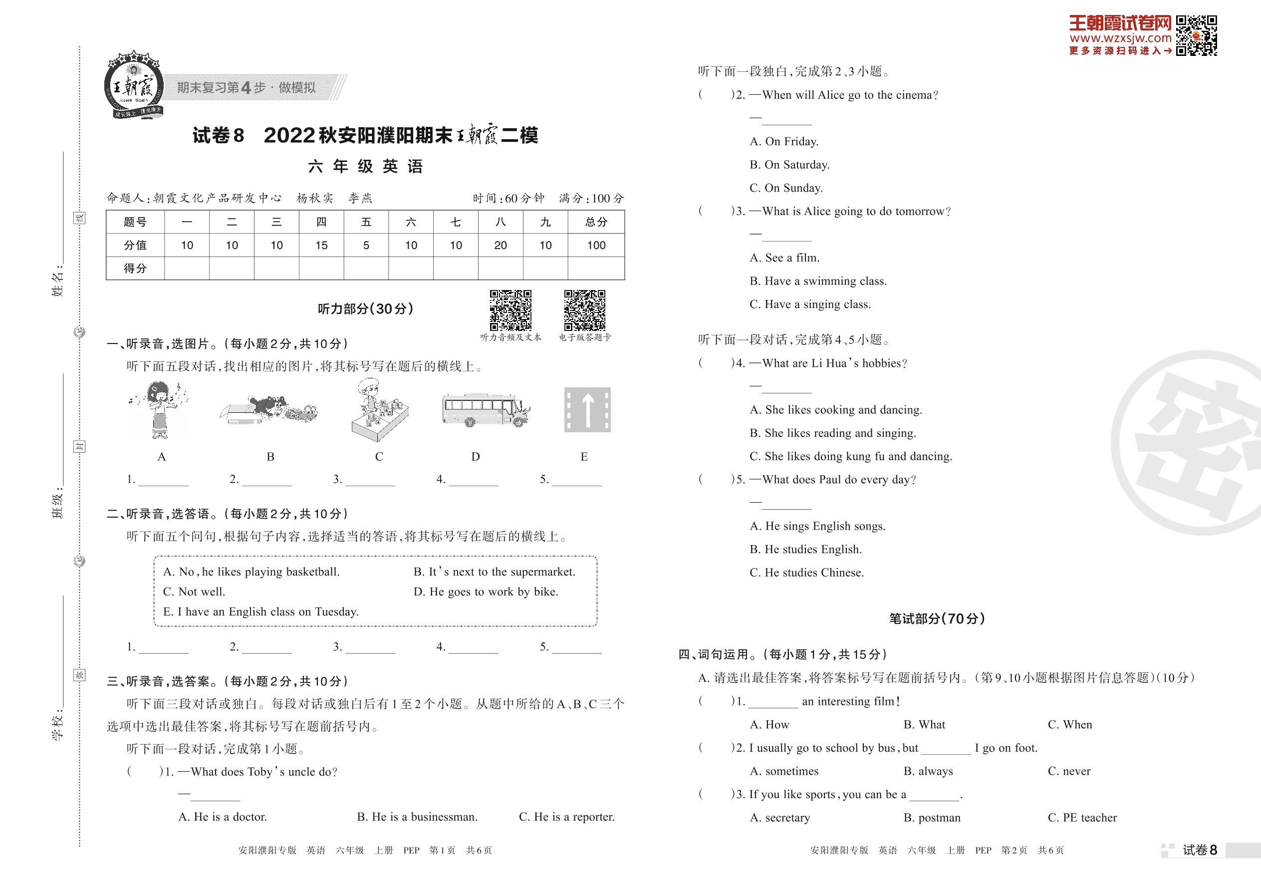 王朝霞期末模拟卷六年级上册英语(PEP版)【8】