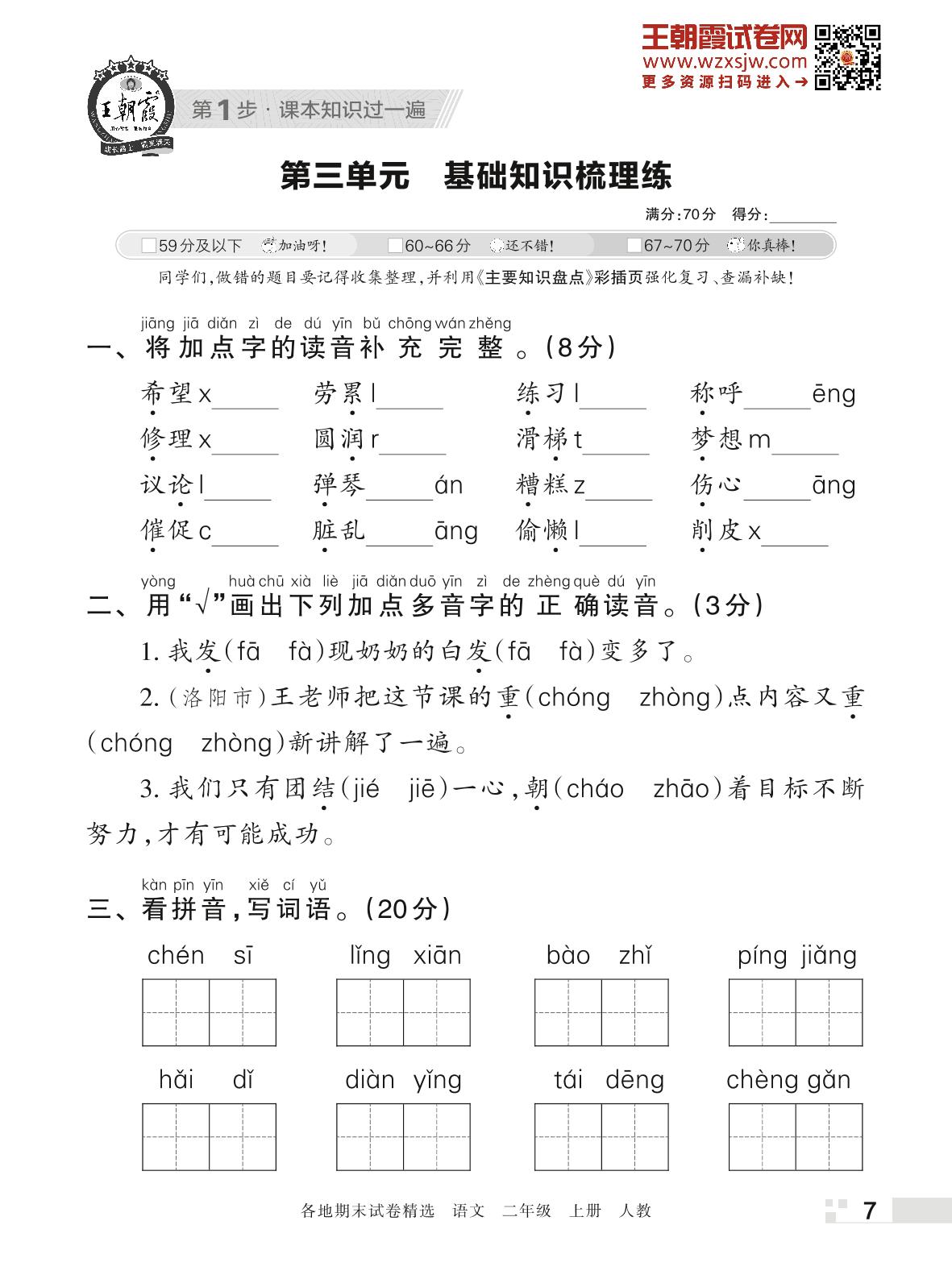 王朝霞期末过课本——第三单元 基础知识梳理练二年级上册语文(人教版)