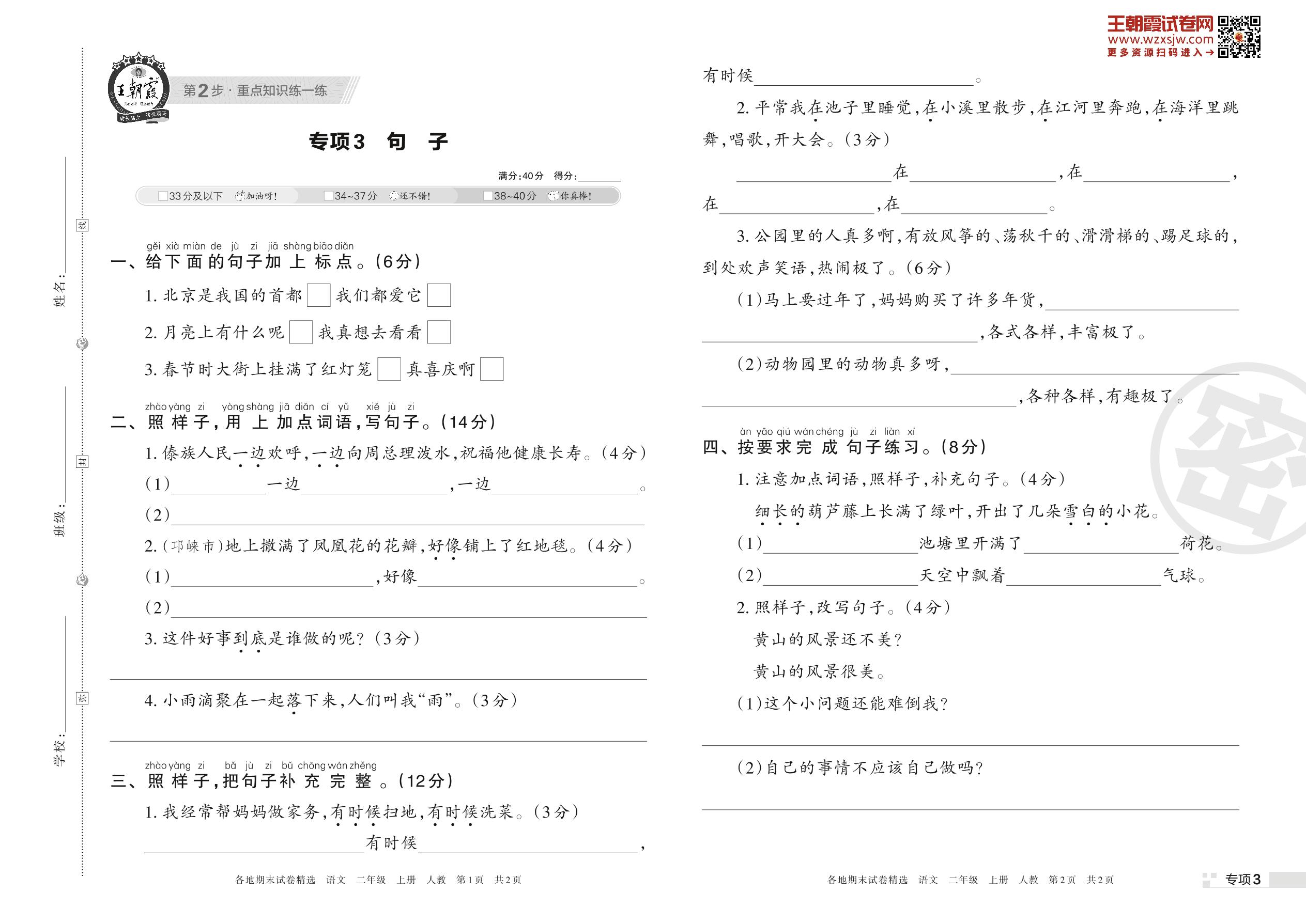 王朝霞期末专项卷——句子二年级上册语文(人教版)【3】