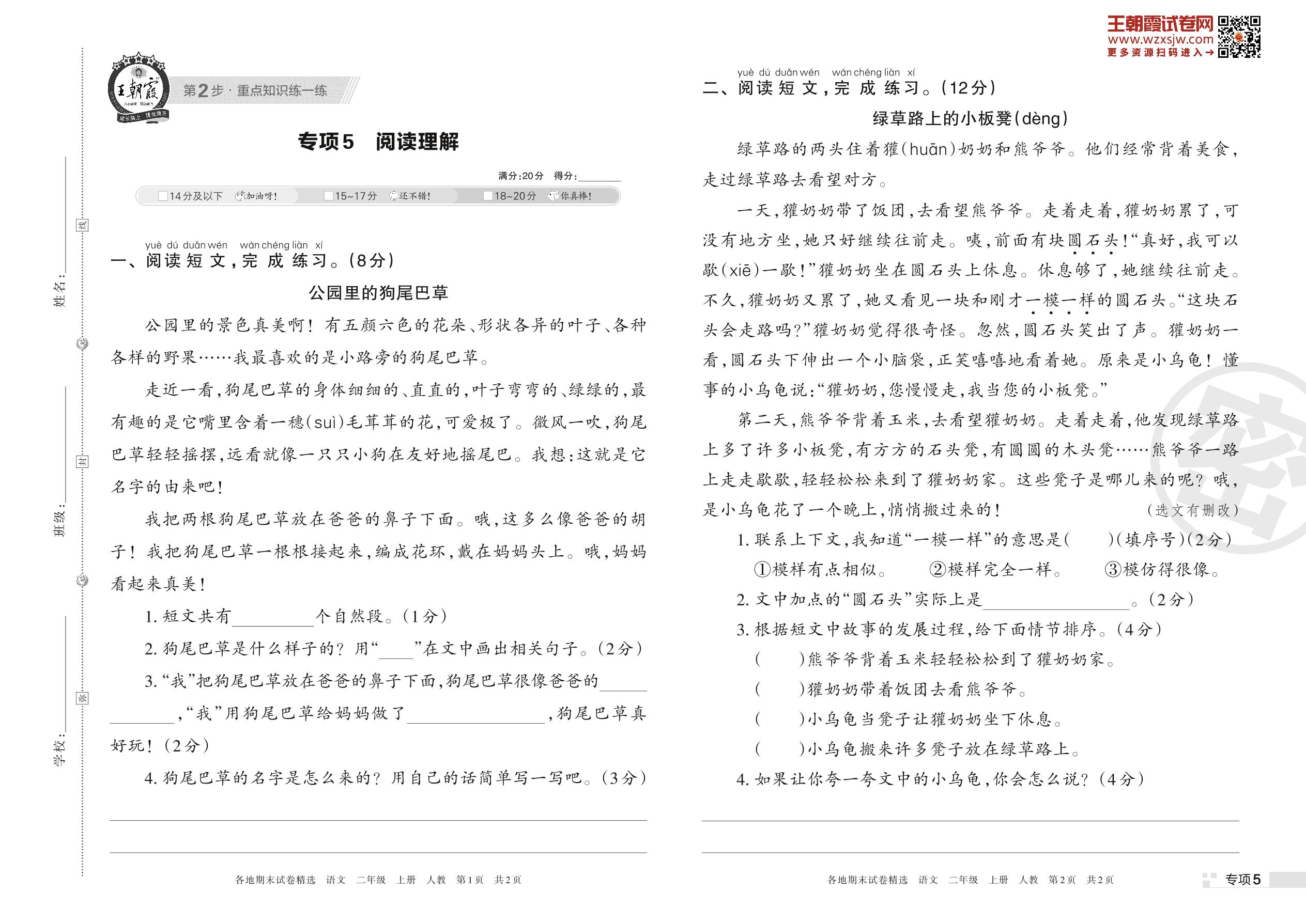 王朝霞期末专项卷——阅读理解二年级上册语文(人教版)【5】