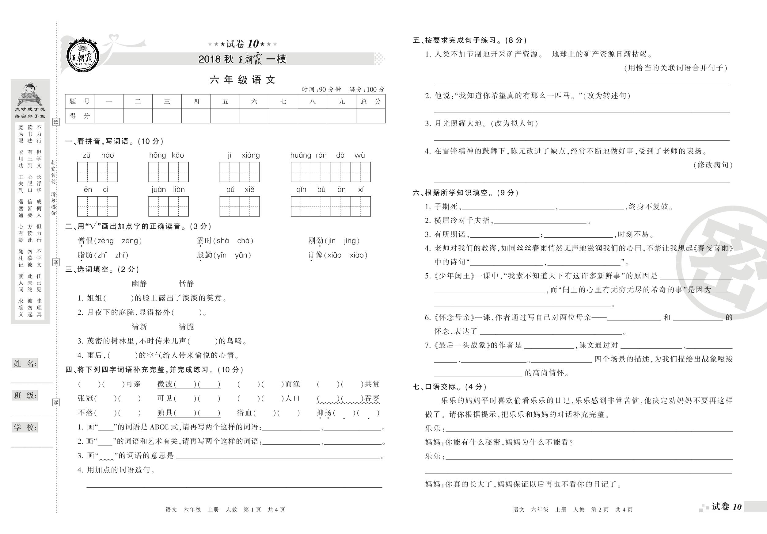 王朝霞期末模拟卷六年级上册语文(人教版)_R210802114635【10】