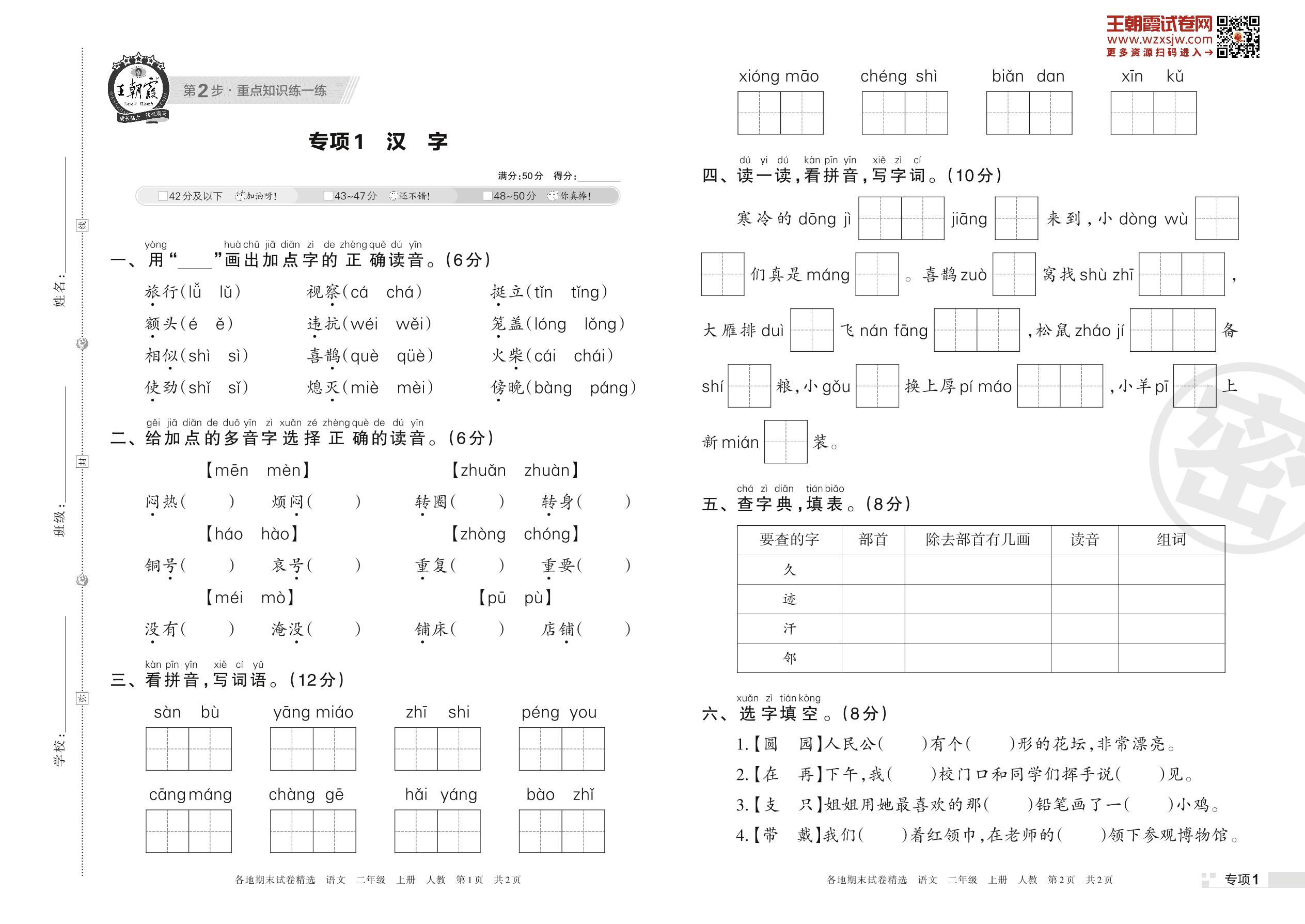 王朝霞期末专项卷——汉字二年级上册语文(人教版)【1】