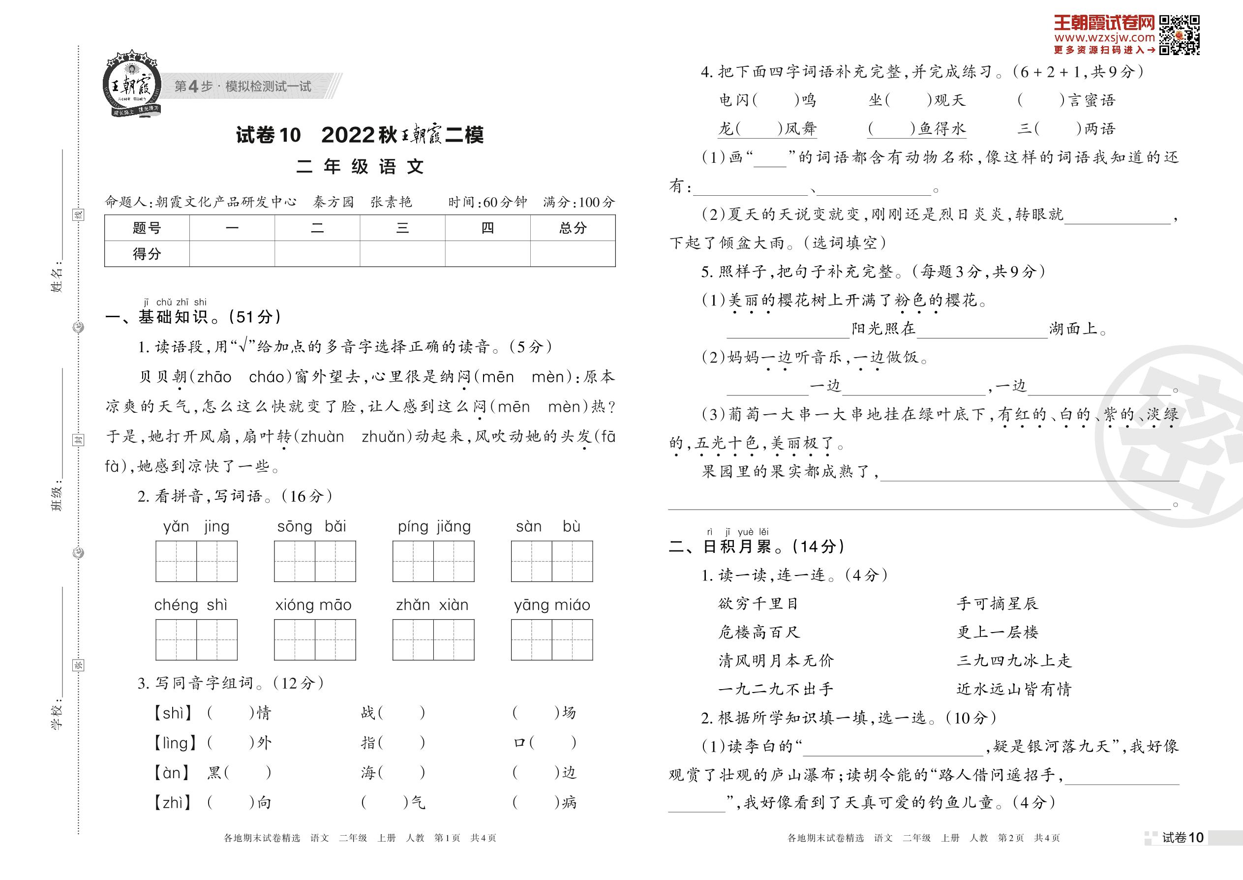 王朝霞期末模拟卷二年级上册语文(人教版)_R221121204120193【10】