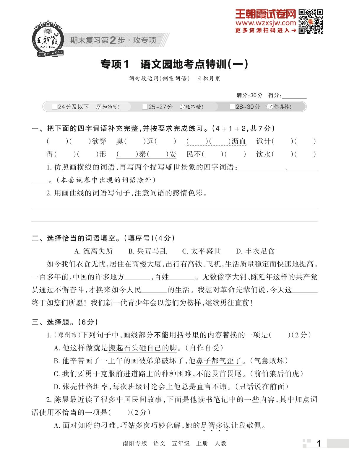王朝霞期末专项卷——语文园地考点特训(一)五年级上册语文(人教版)_R221121212401314【1】