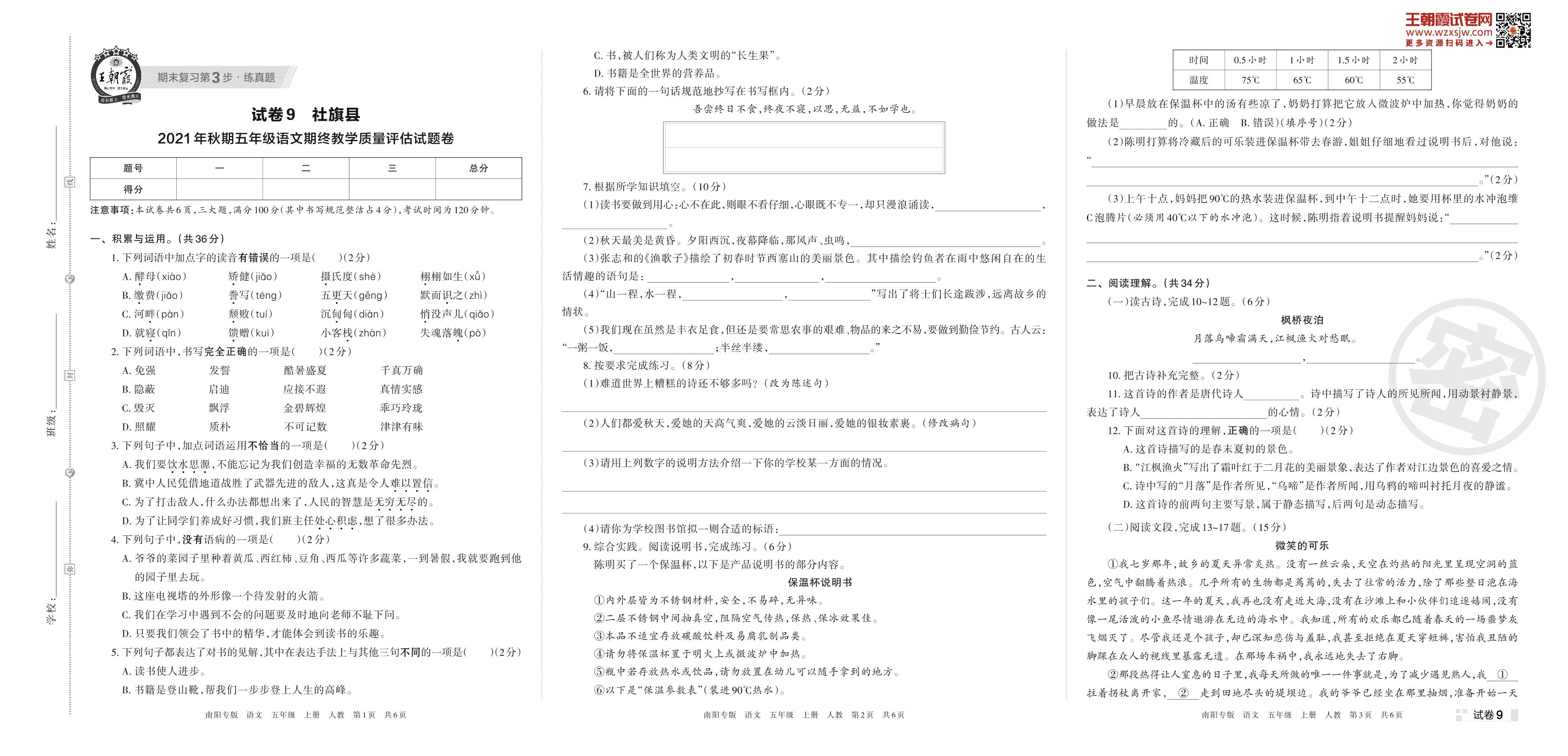 社旗县2021年秋期五年级语文期终教学质量评估试题卷(人教版)【9】