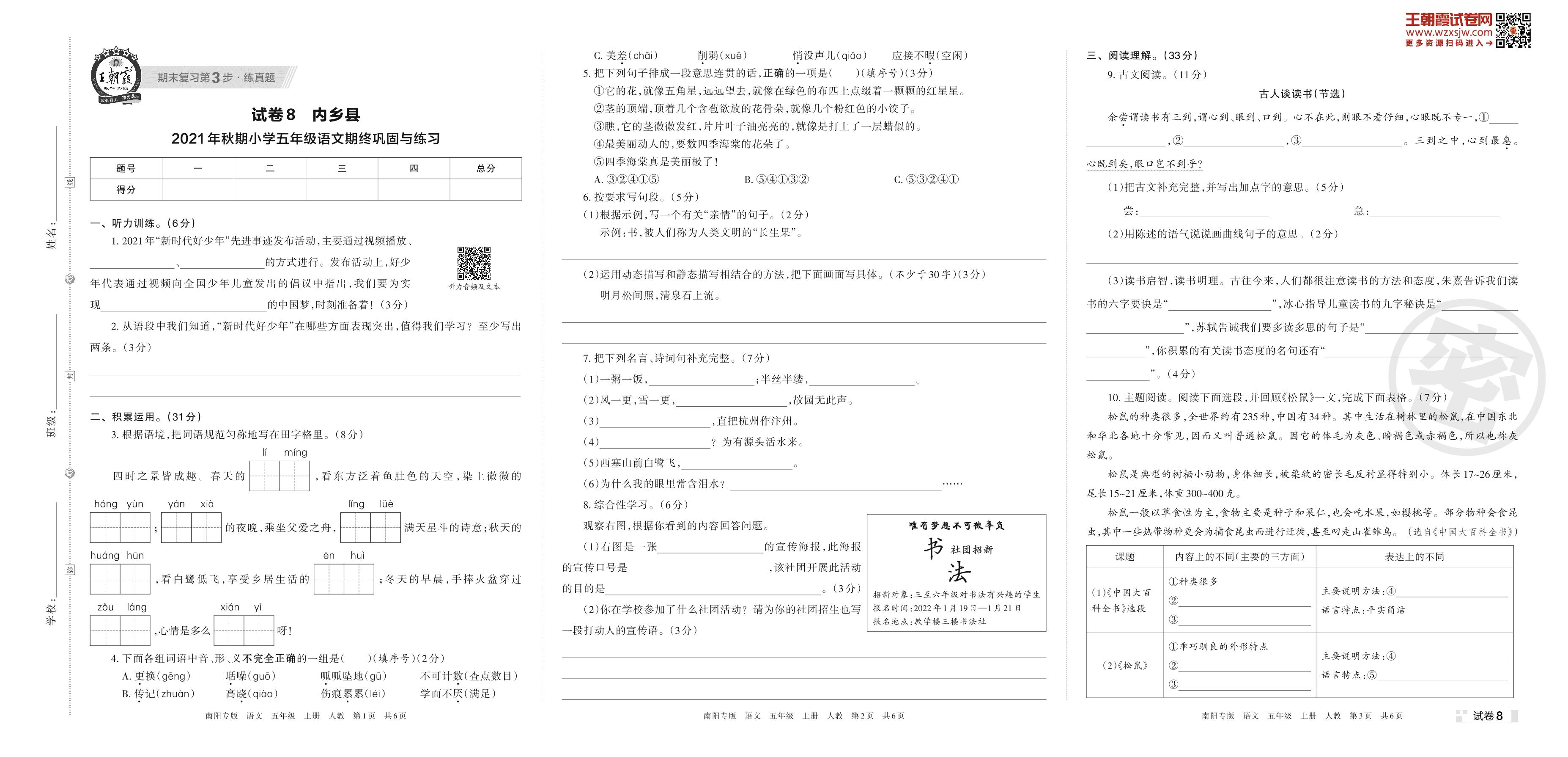 内乡县2021年秋期小学五年级语文期终巩固与练习(人教版)【8】