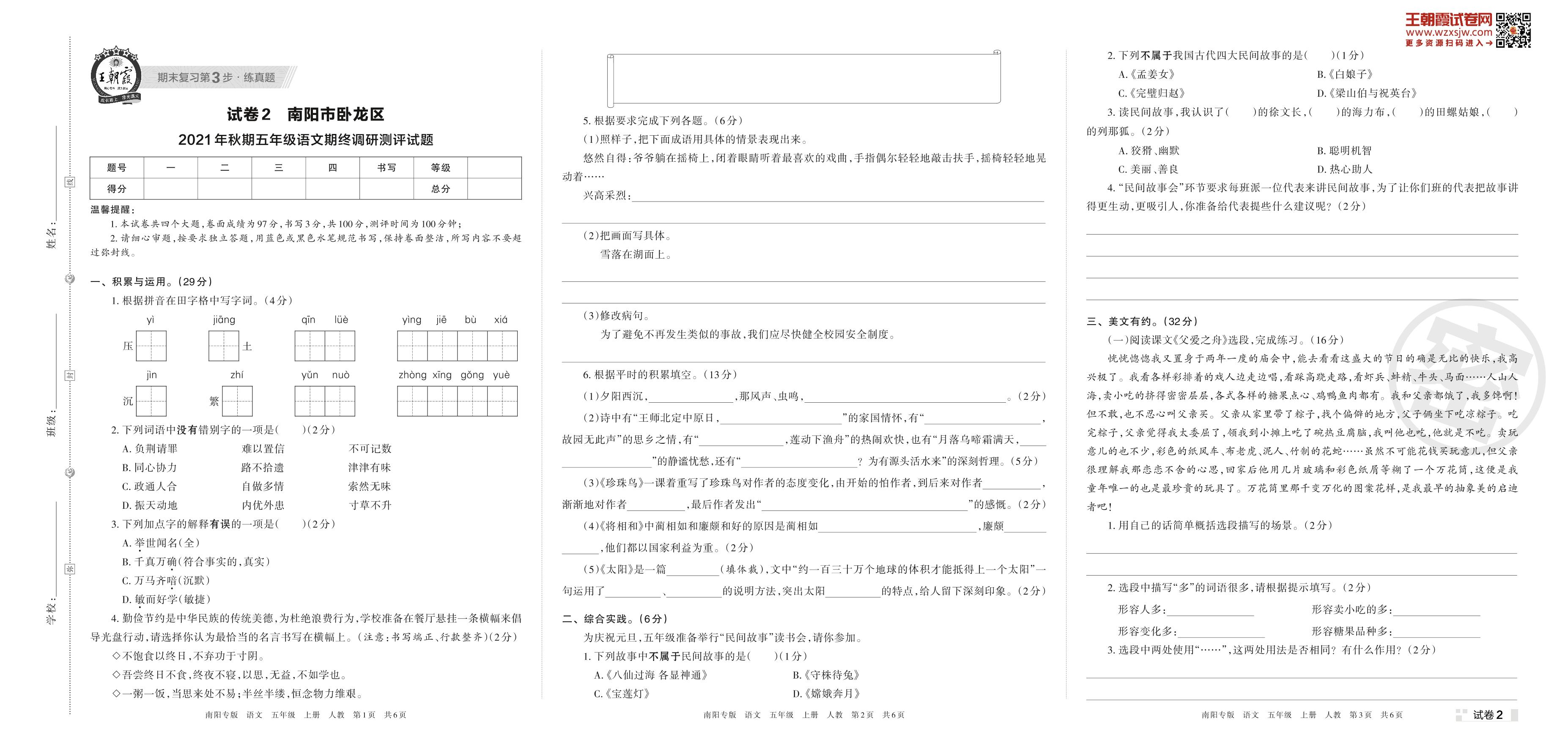 南阳市卧龙区2021年秋期五年级语文期终调研测评试题(人教版)【2】