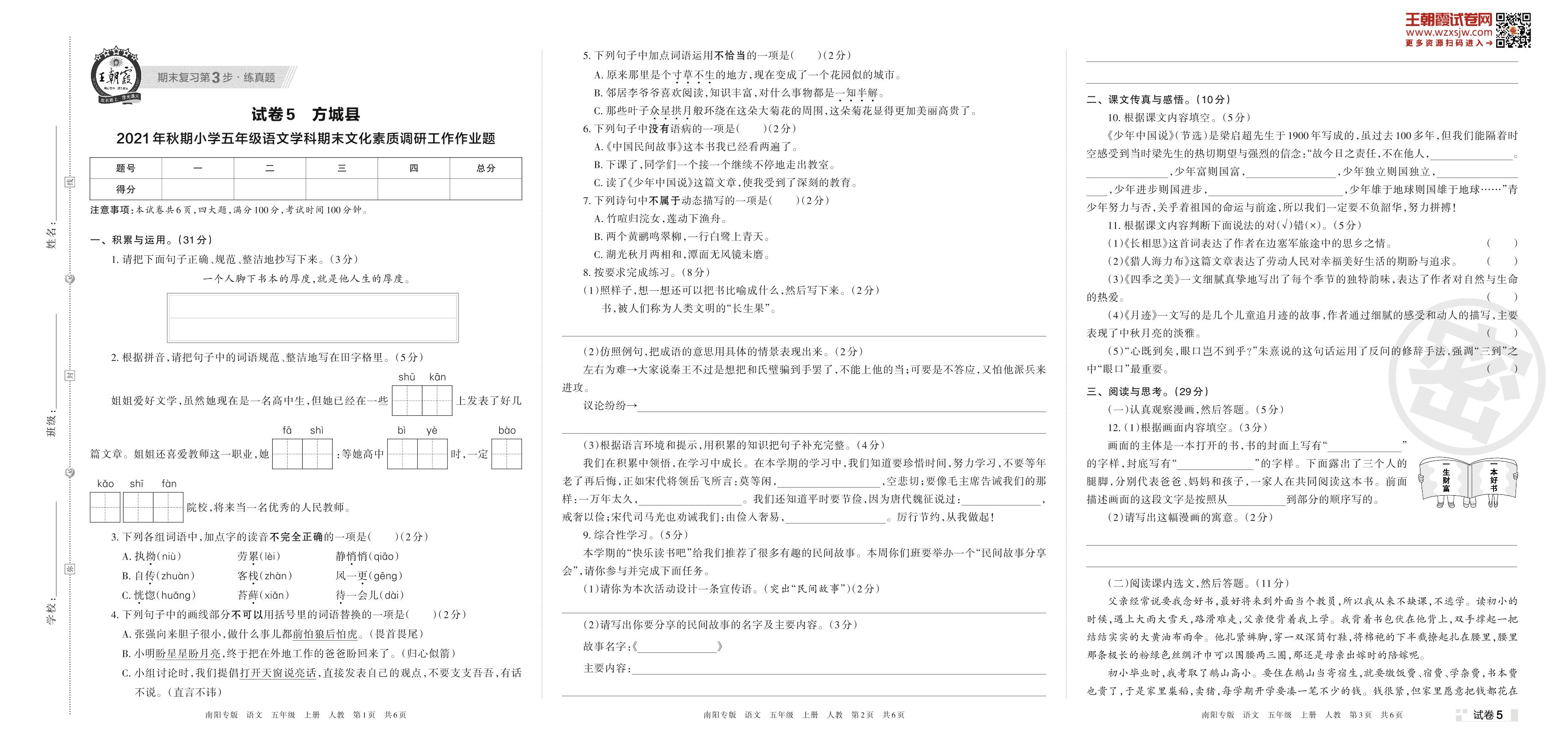 方城县2021年秋期小学五年级语文学科期末文化素质调研工作作业题(人教版)【5】