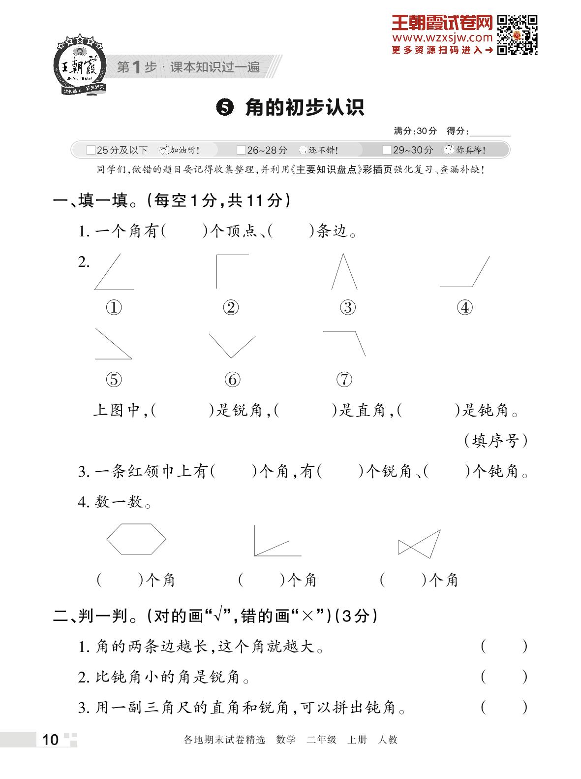 王朝霞期末过课本——5 角的初步认识二年级上册数学(人教版)
