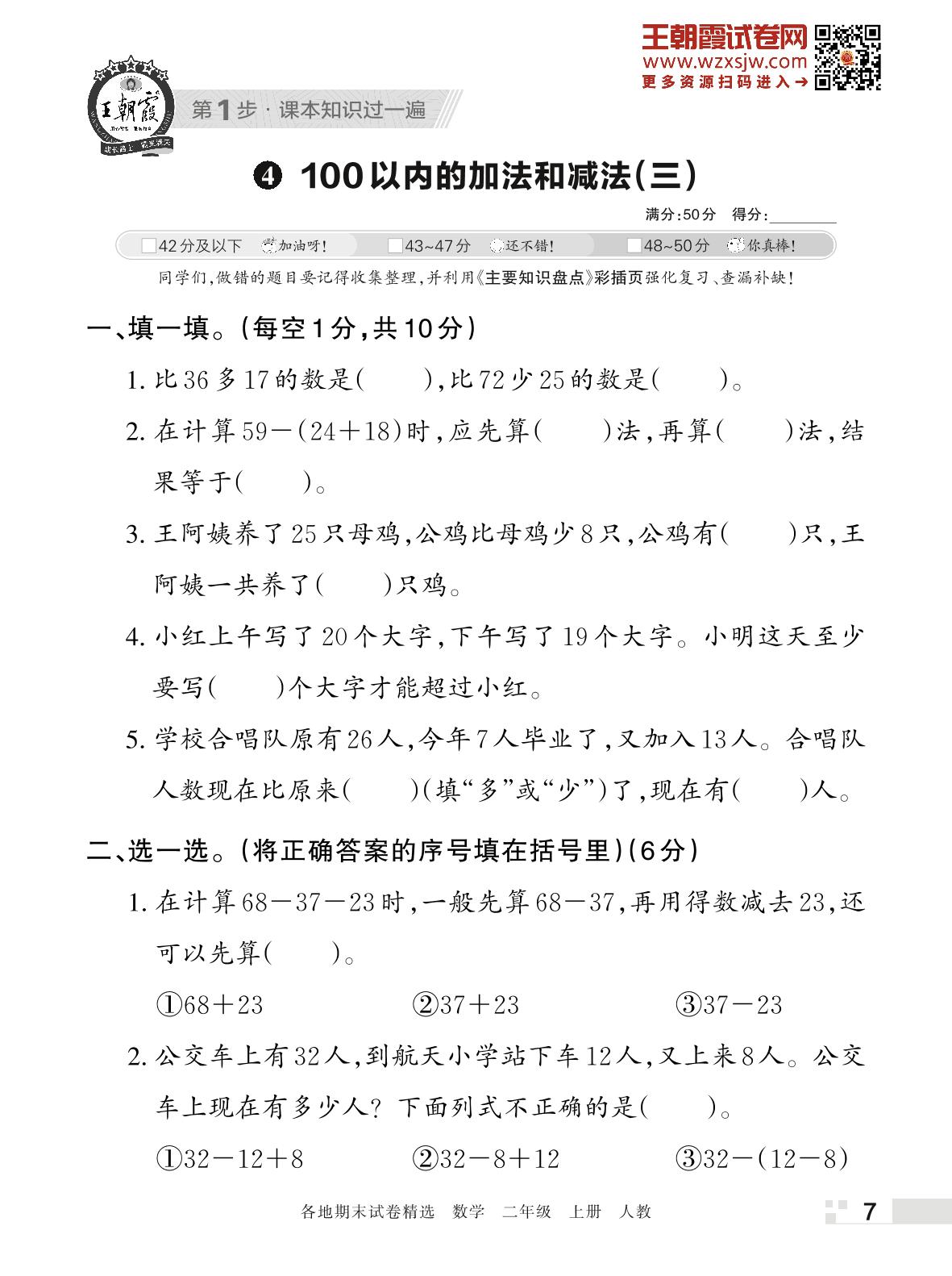 王朝霞期末过课本——4 100以内的加法和减法(三)二年级上册数学(人教版)