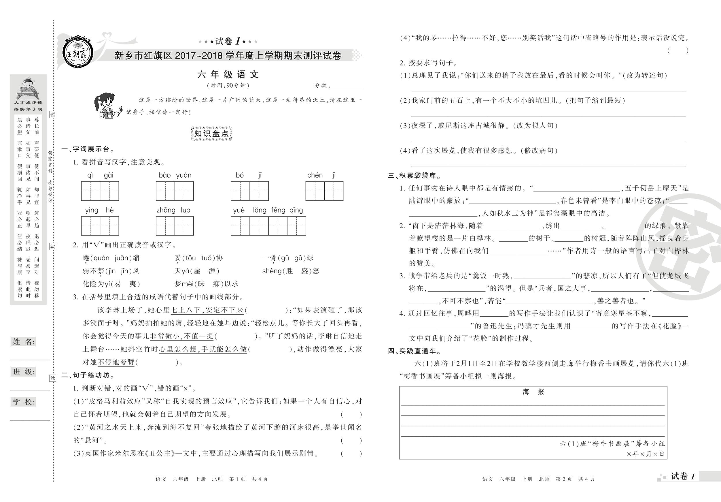 2017-2018学年第一学期新乡市红旗区六年级语文试卷(北师版)【1】