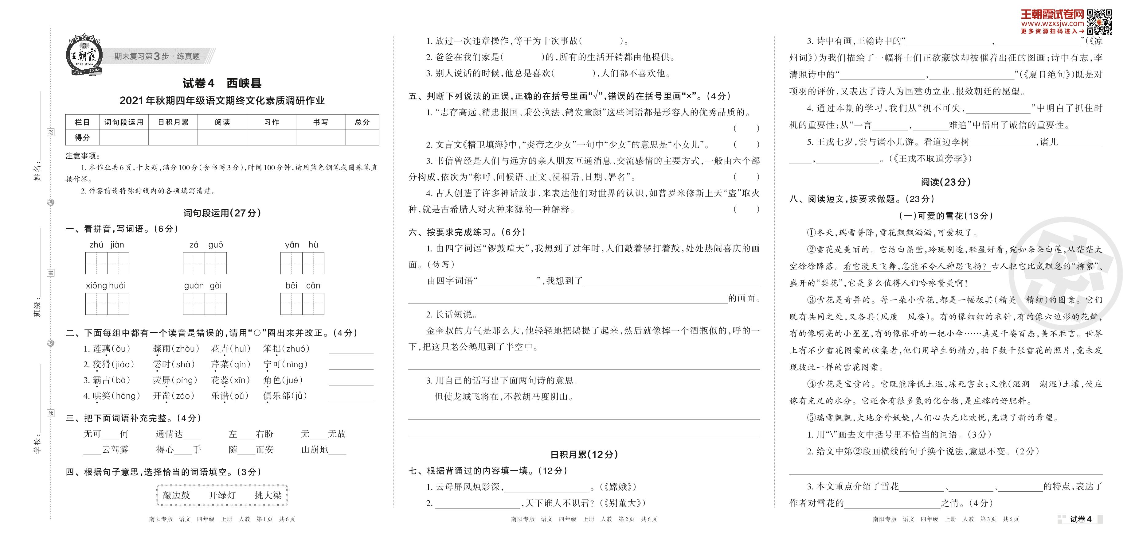西峡县2021年秋期四年级语文期终文化素质调研作业(人教版)【4】