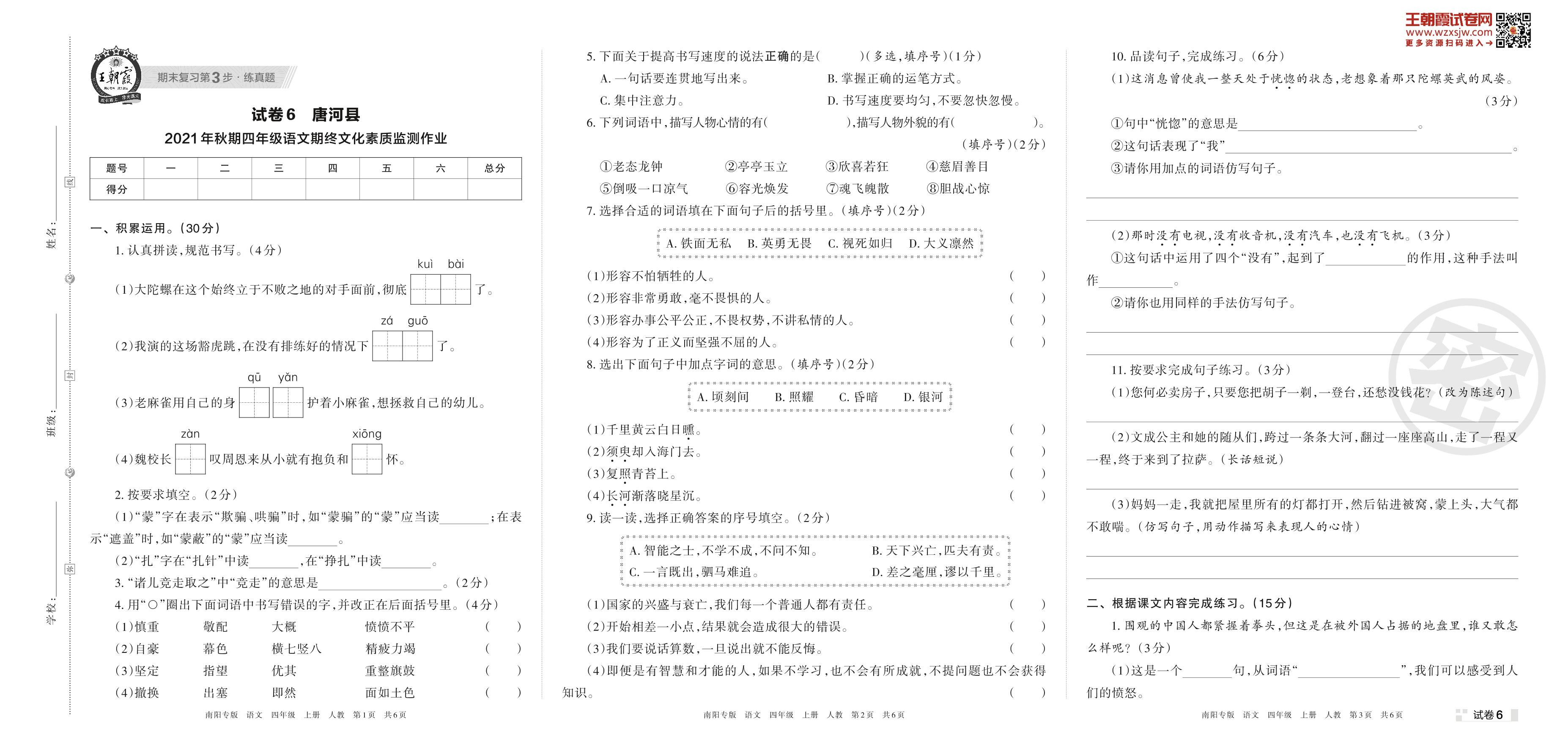 唐河县2021年秋期四年级语文期终文化素质监测作业(人教版)【6】