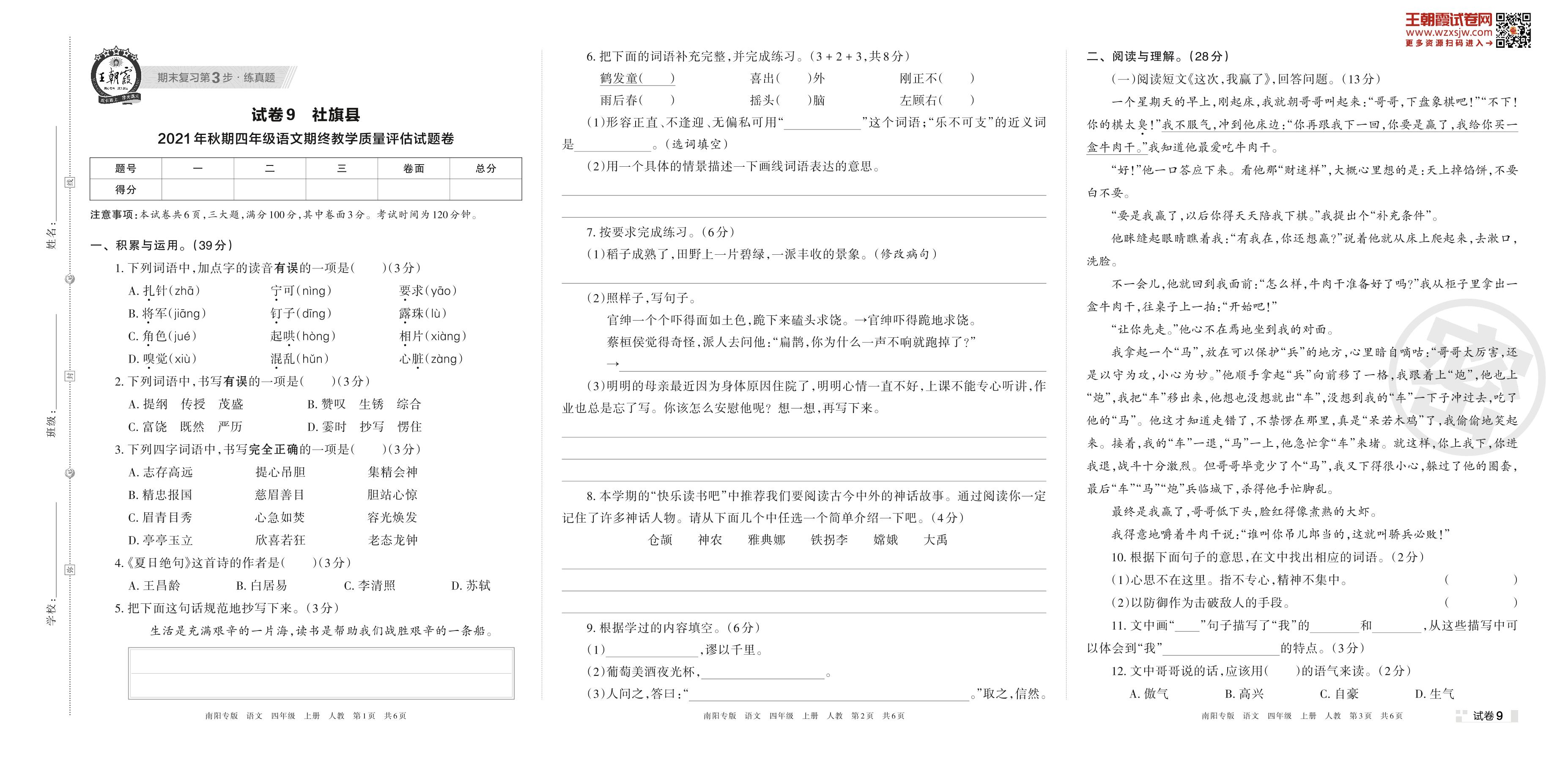 社旗县2021年秋期四年级语文期终教学质量评估试题卷(人教版)【9】