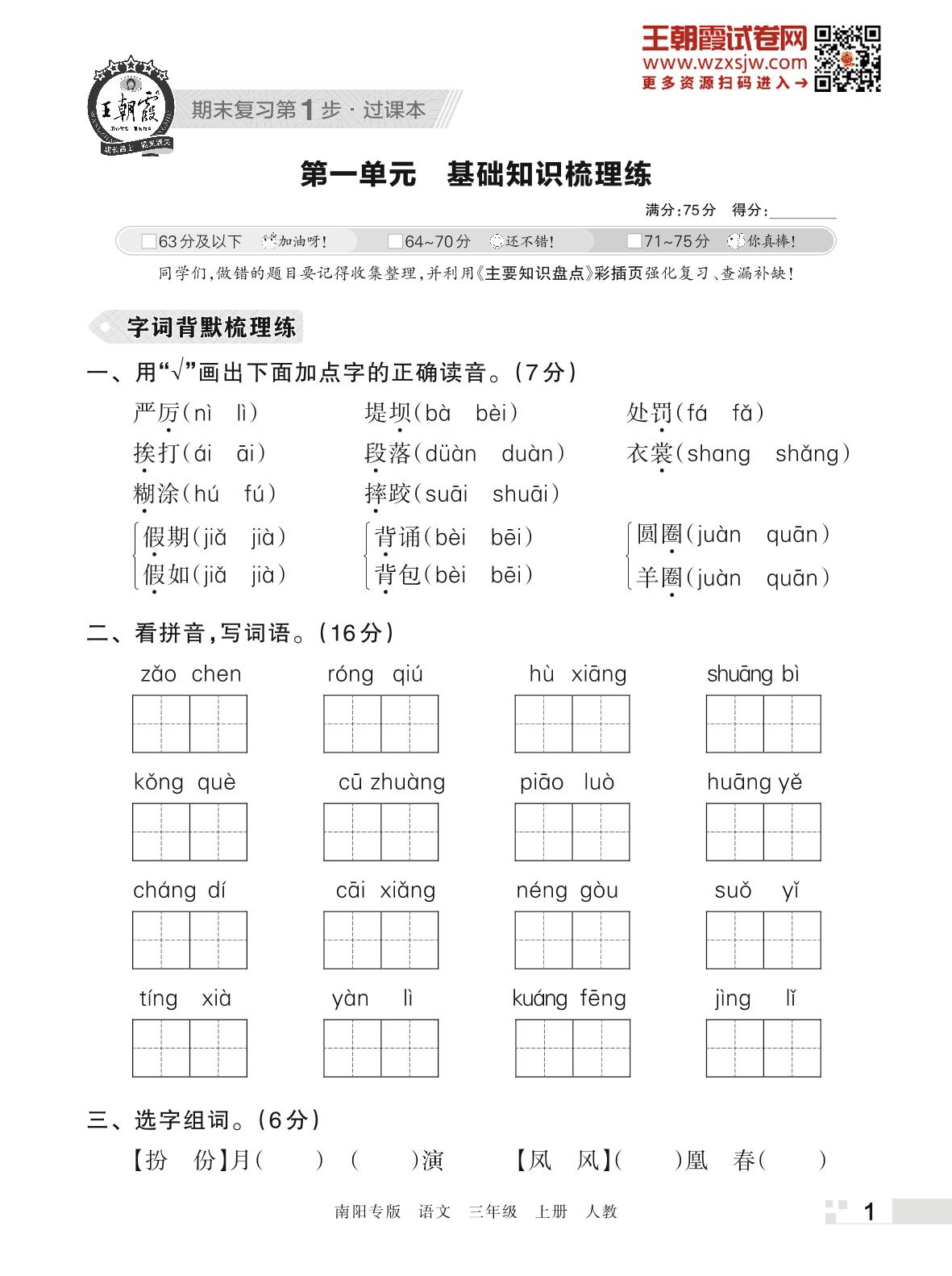 王朝霞期末过课本——第一单元 基础知识梳理练三年级上册语文(人教版)_R221121215426936
