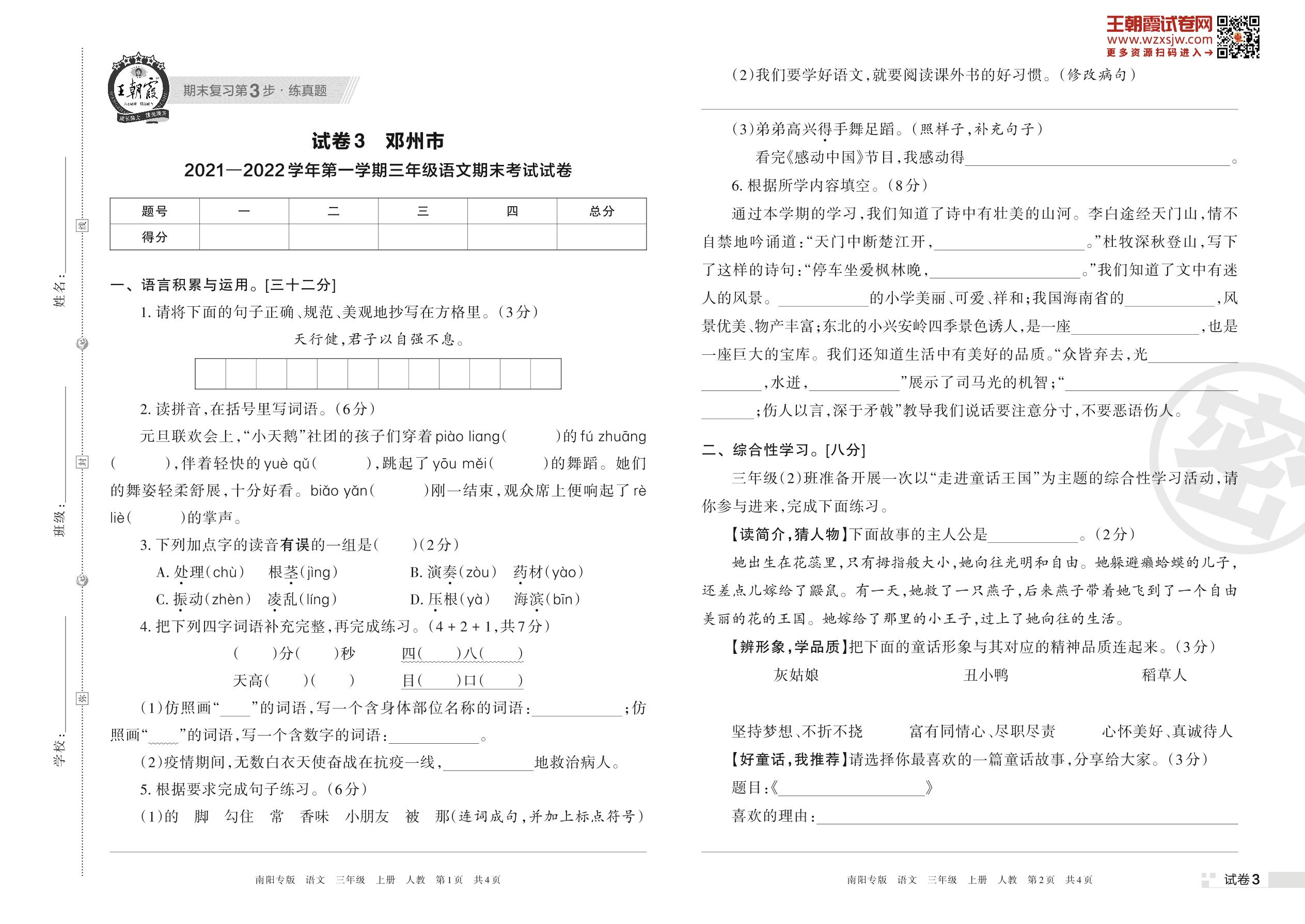 邓州市2021—2022学年第一学期三年级语文期末考试试卷(人教版)【3】