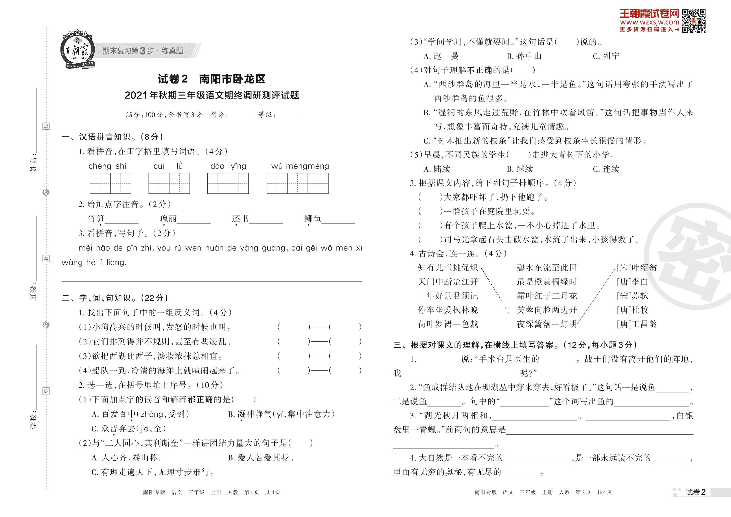 南阳市卧龙区2021年秋期三年级语文期终调研测评试题(人教版)【2】
