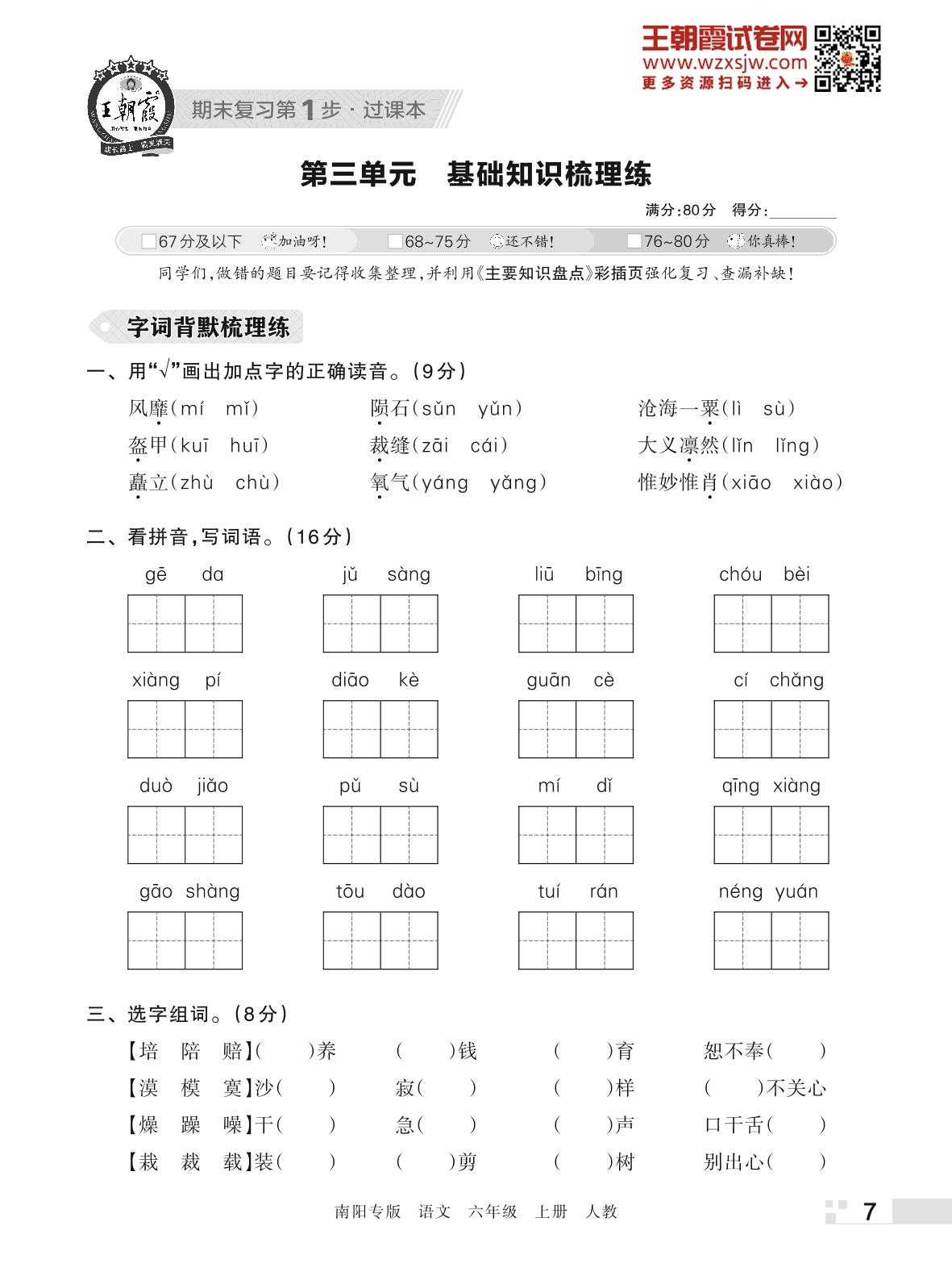王朝霞期末过课本——第三单元 基础知识梳理练六年级上册语文(人教版)_R221121220740377