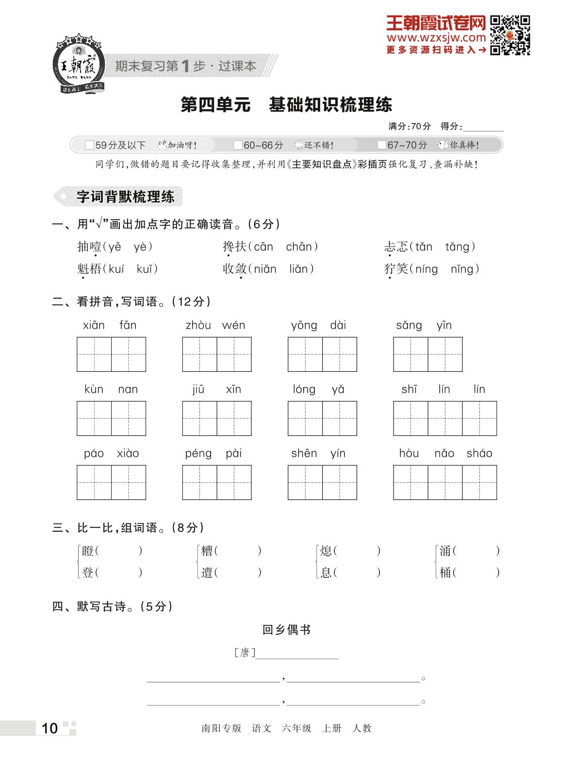 王朝霞期末过课本——第四单元 基础知识梳理练六年级上册语文(人教版)_R221121220740852