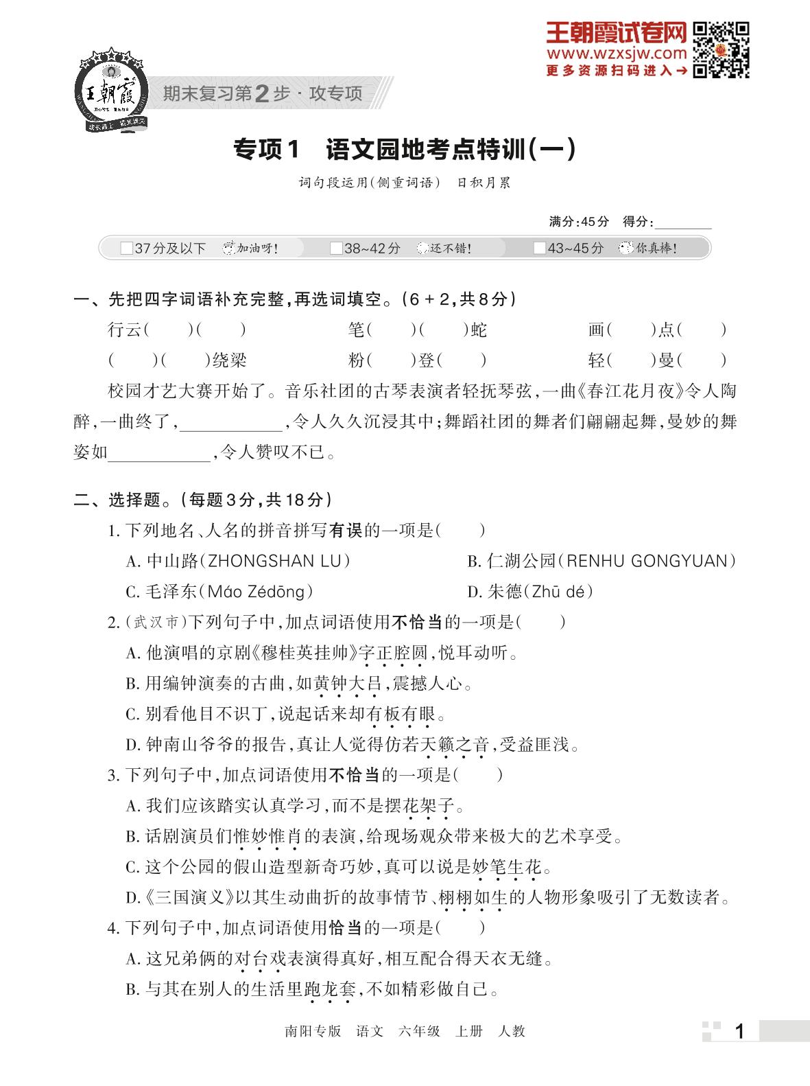 王朝霞期末专项卷——语文园地考点特训(一)六年级上册语文(人教版)_R221121220741296【1】