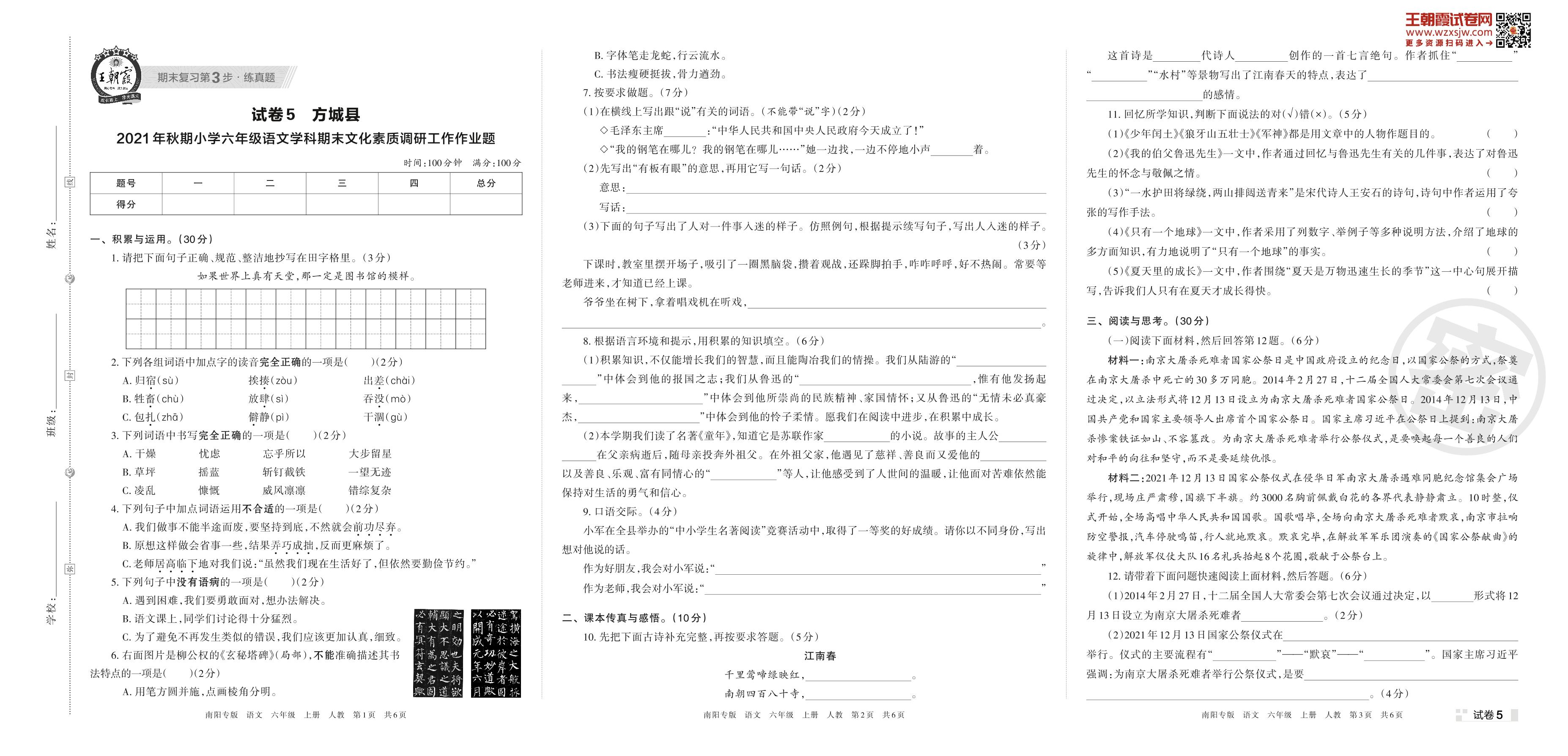 方城县2021年秋期小学六年级语文学科期末文化素质调研工作作业题(人教版)【5】