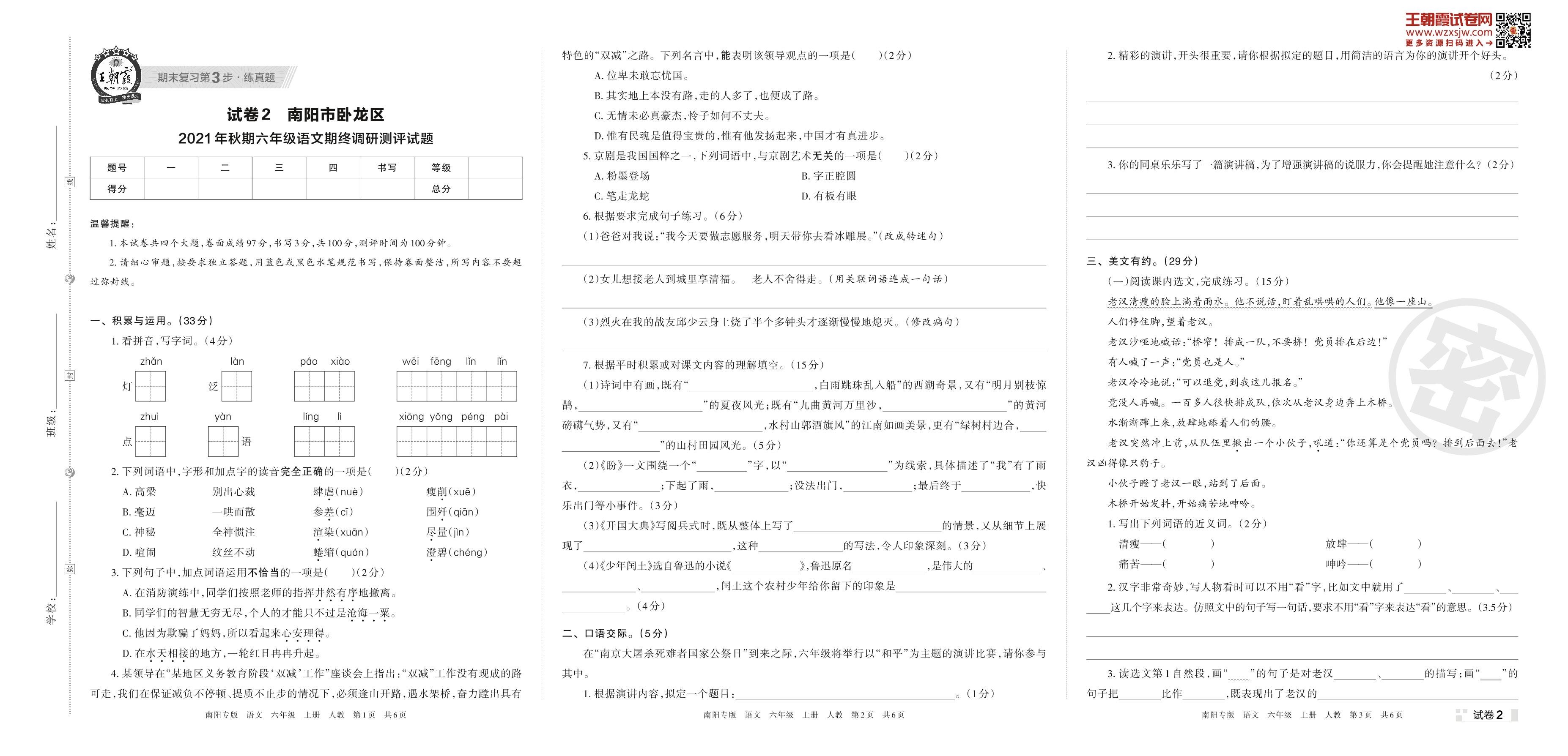 南阳市卧龙区2021年秋期六年级语文期终调研测评试(人教版)【2】