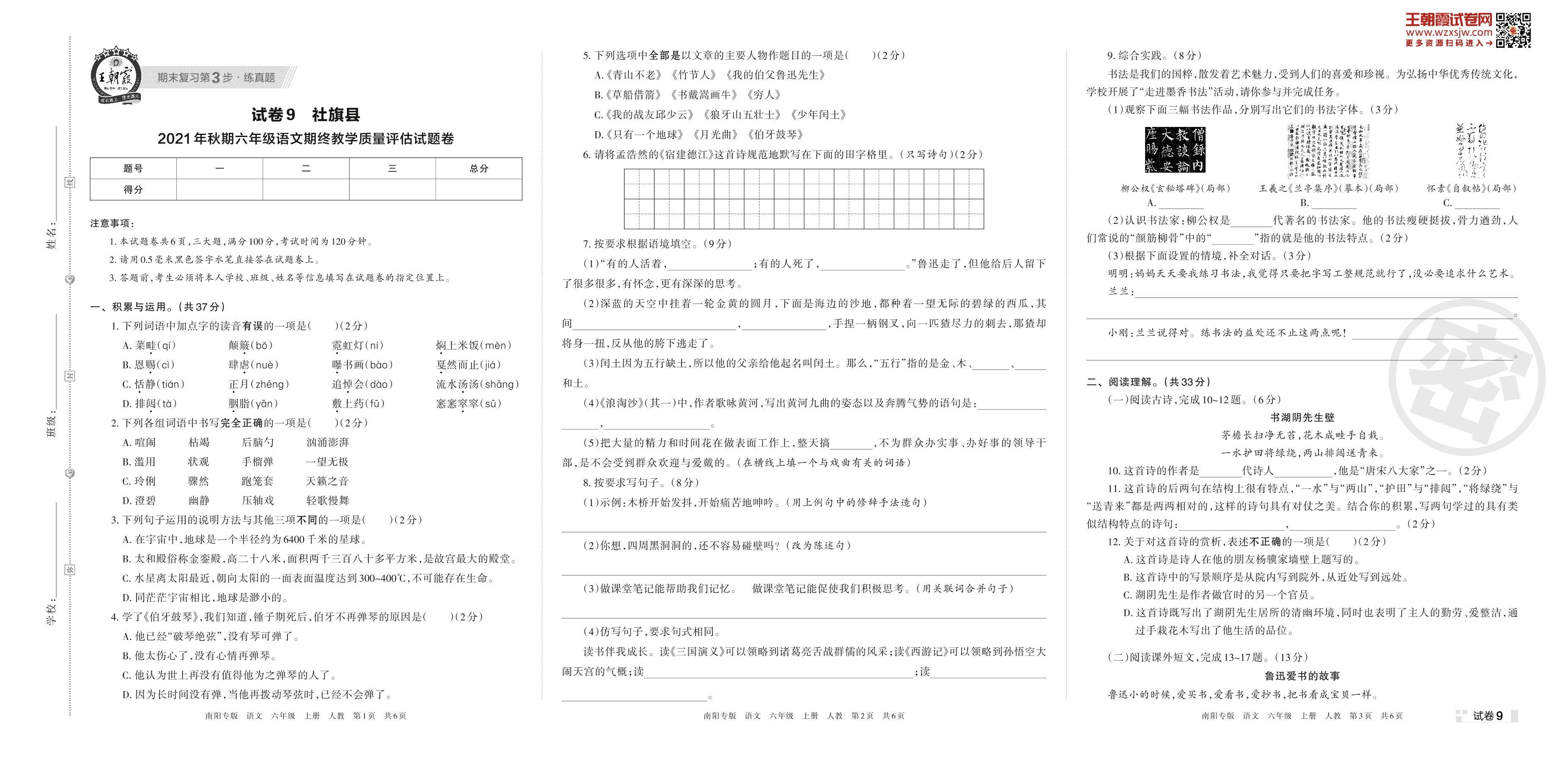 社旗县2021年秋期六年级语文期终教学质量评估试题卷(人教版)【9】